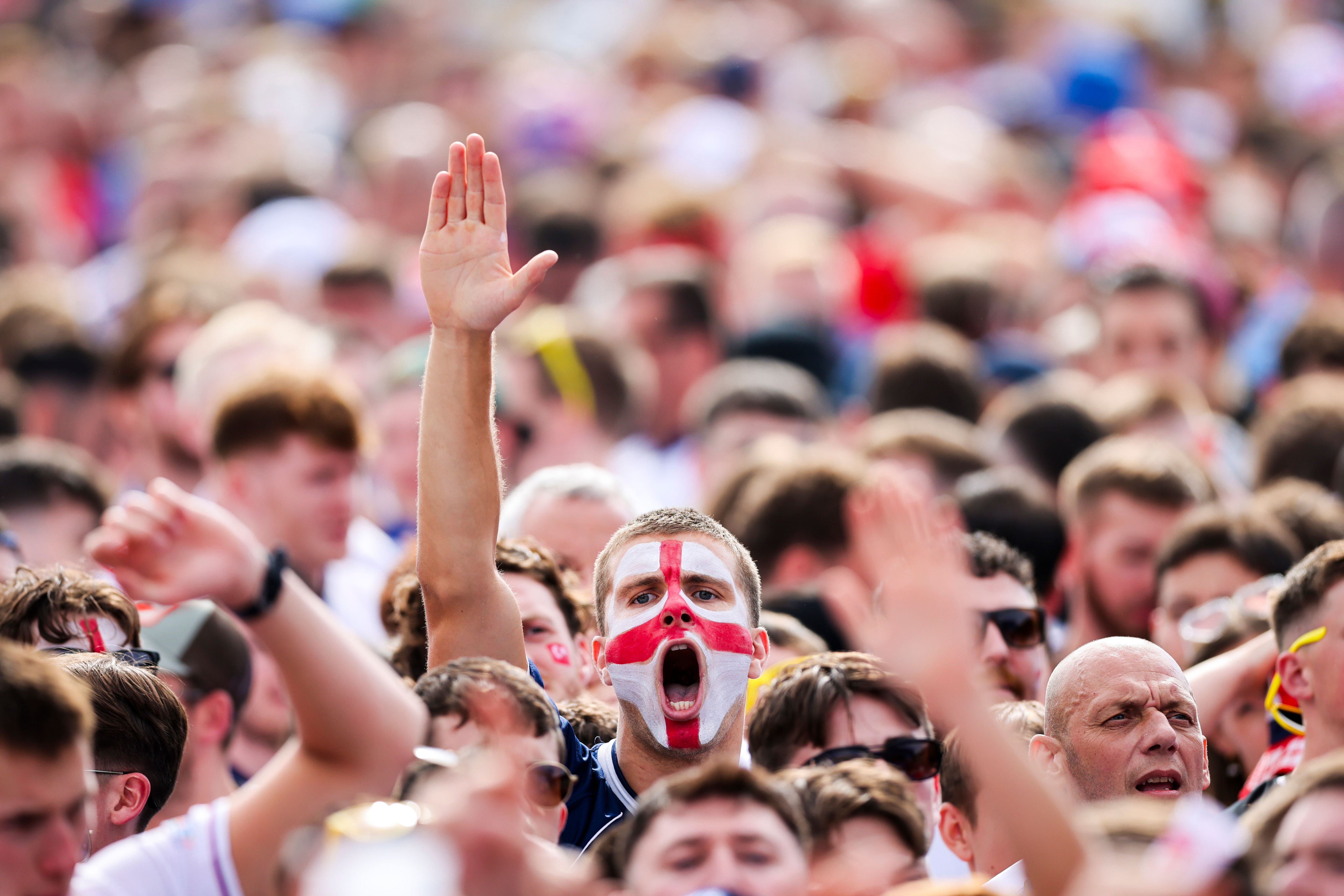 An England fan cheers on his team during the screening of a quarter-final match between England and Switzerland at the Euro 2024 football tournament in Dusseldorf, Germany on July 6, 2024. (Photo by Christoph Reichwein/AP Photo)