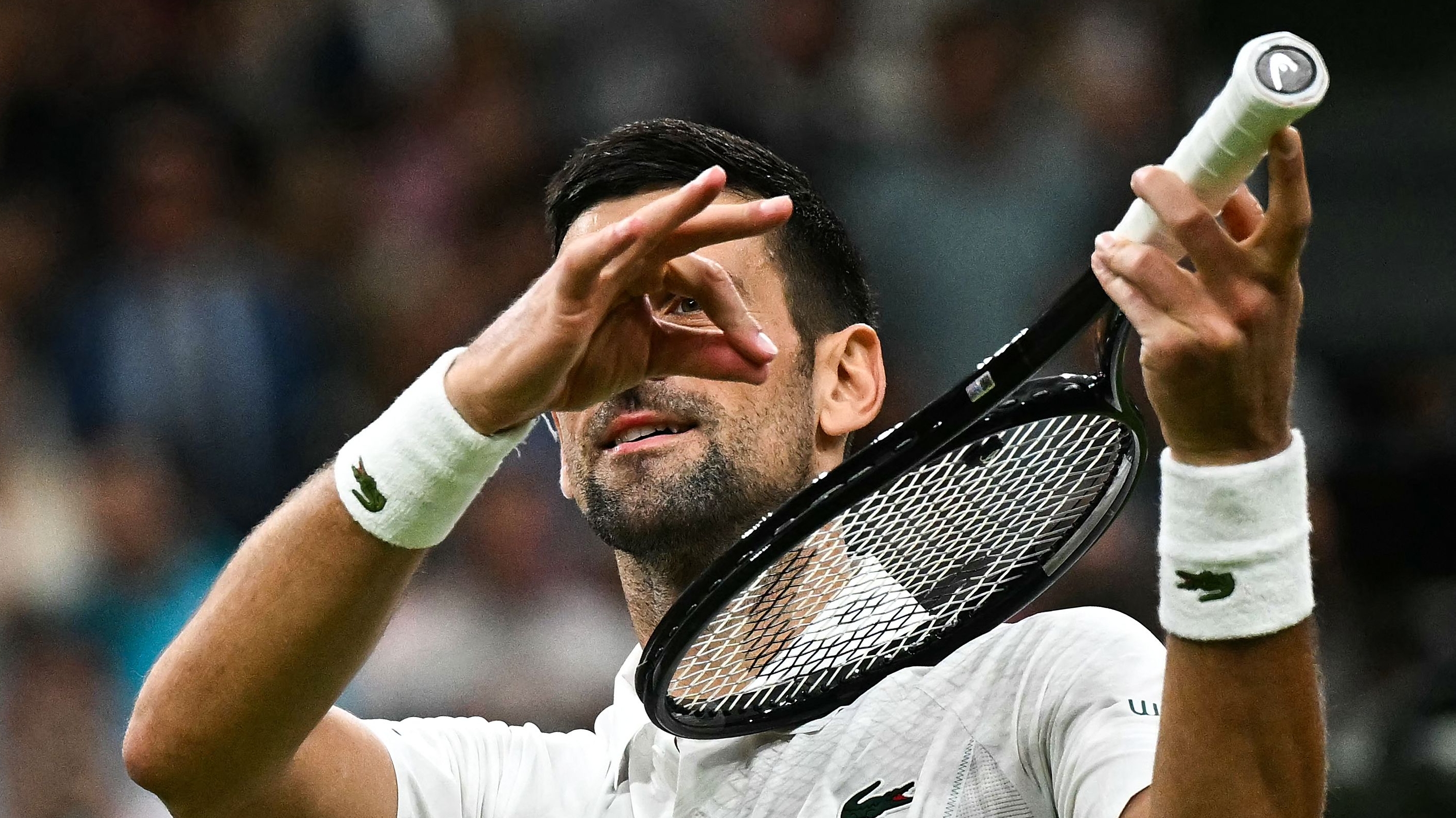 Serbia's Novak Djokovic pretends to play the violin for his daughter as he celebrates winning against Denmark's Holger Rune during their men's singles tennis match on the eighth day of the 2024 Wimbledon Championships at The All England Lawn Tennis and Croquet Club in Wimbledon, southwest London, on July 8, 2024. (Photo by Ben Stansall/AFP Photo)