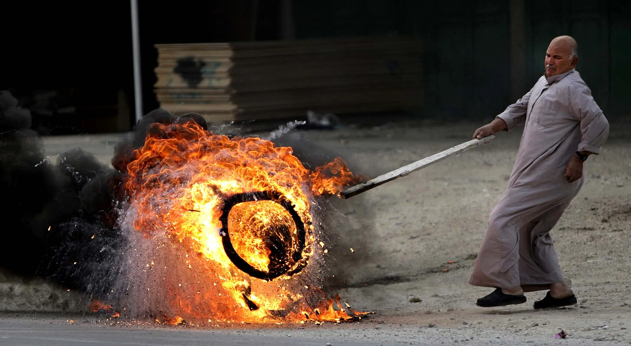 A man pushes a burning tire in the West Bank town of Nablus during a rally in support of Palestinian prisoners, February 22, 2013. (Photo by Nasser Ishtayeh/Asociated Press)