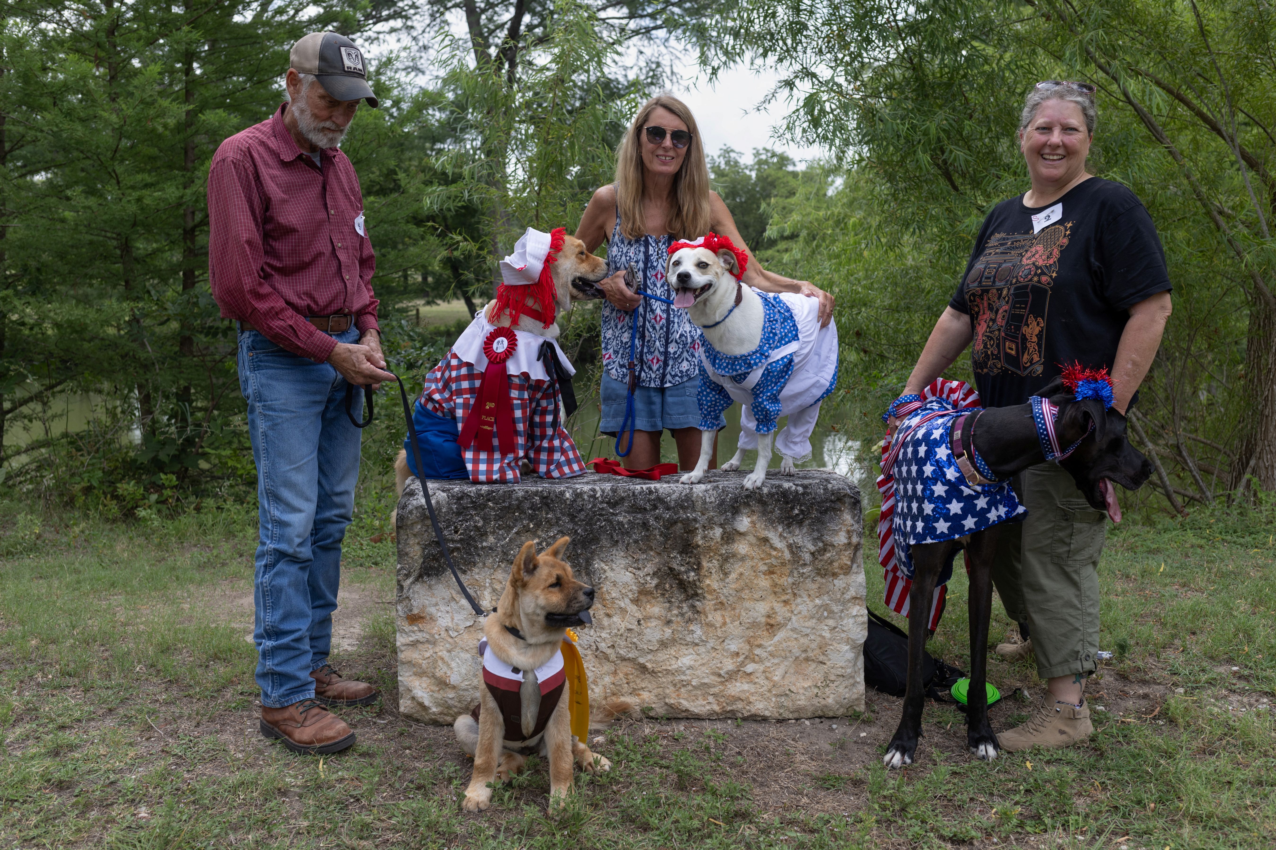 Residents pose with their dogs after the city’s 28th annual Pet Parade during Fourth of July Independence Day celebrations in Bandera, Texas on July 4, 2024. (Photo by Adrees Latif/Reuters)