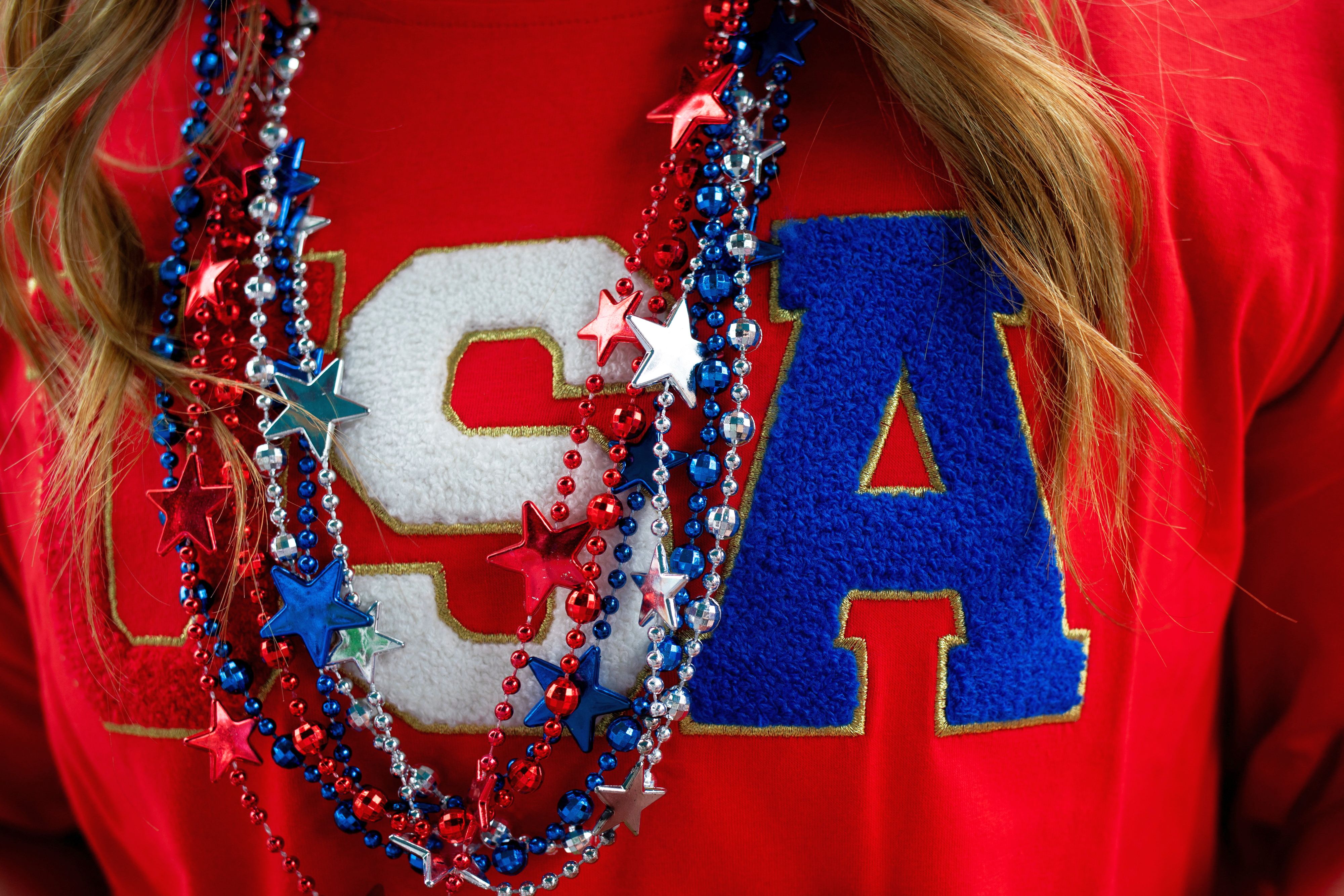 An attendee wears patriotic attire and necklaces during an annual carnival to celebrate July 4th at Clawson Park, Michigan on July 4, 2024. (Photo by Emily Elconin/Reuters)