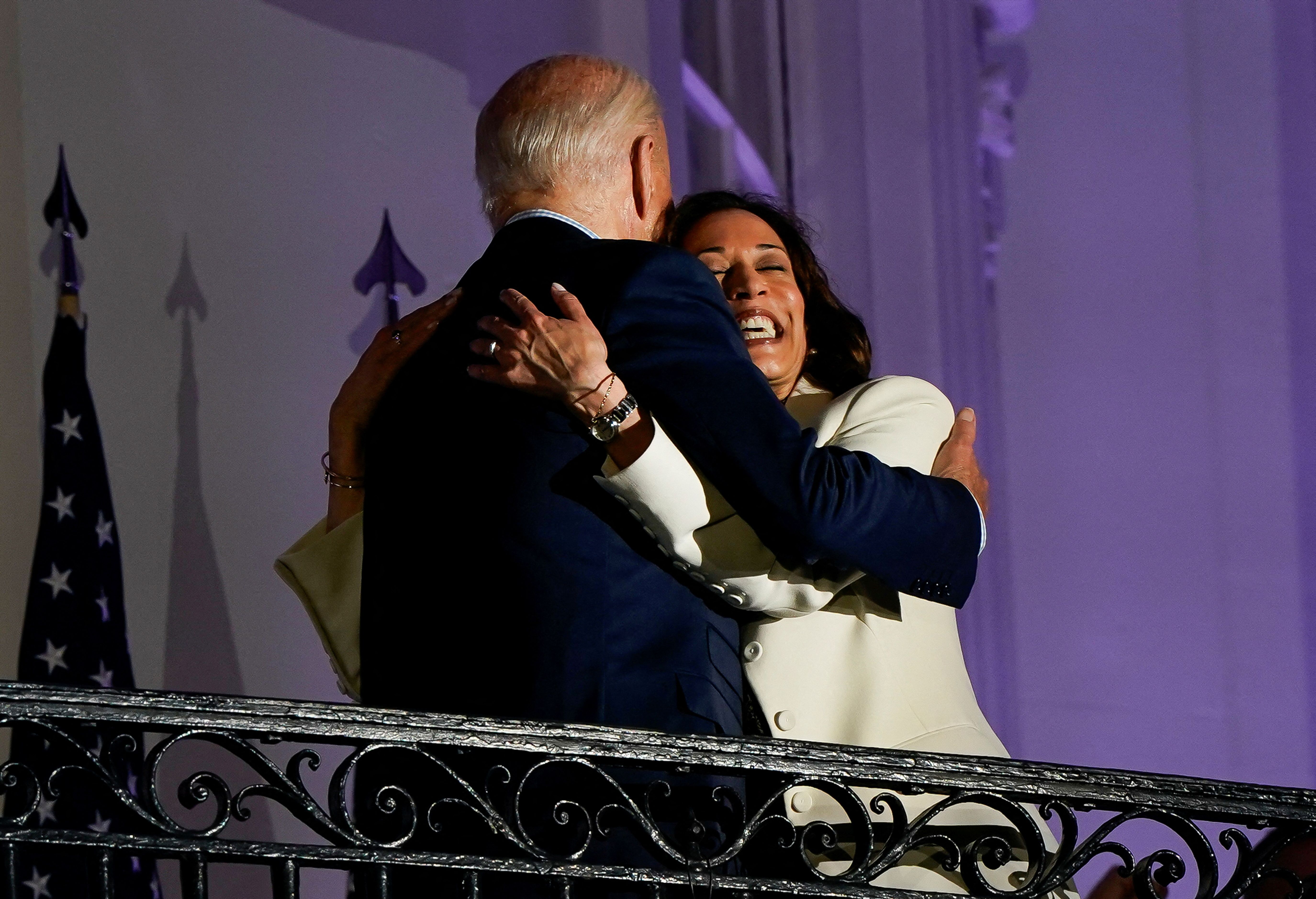 U.S. President Joe Biden and Vice President Kamala Harris embrace during an Independence Day celebration in Washington on July 5, 2024. (Photo by Elizabeth Frantz/Reuters)