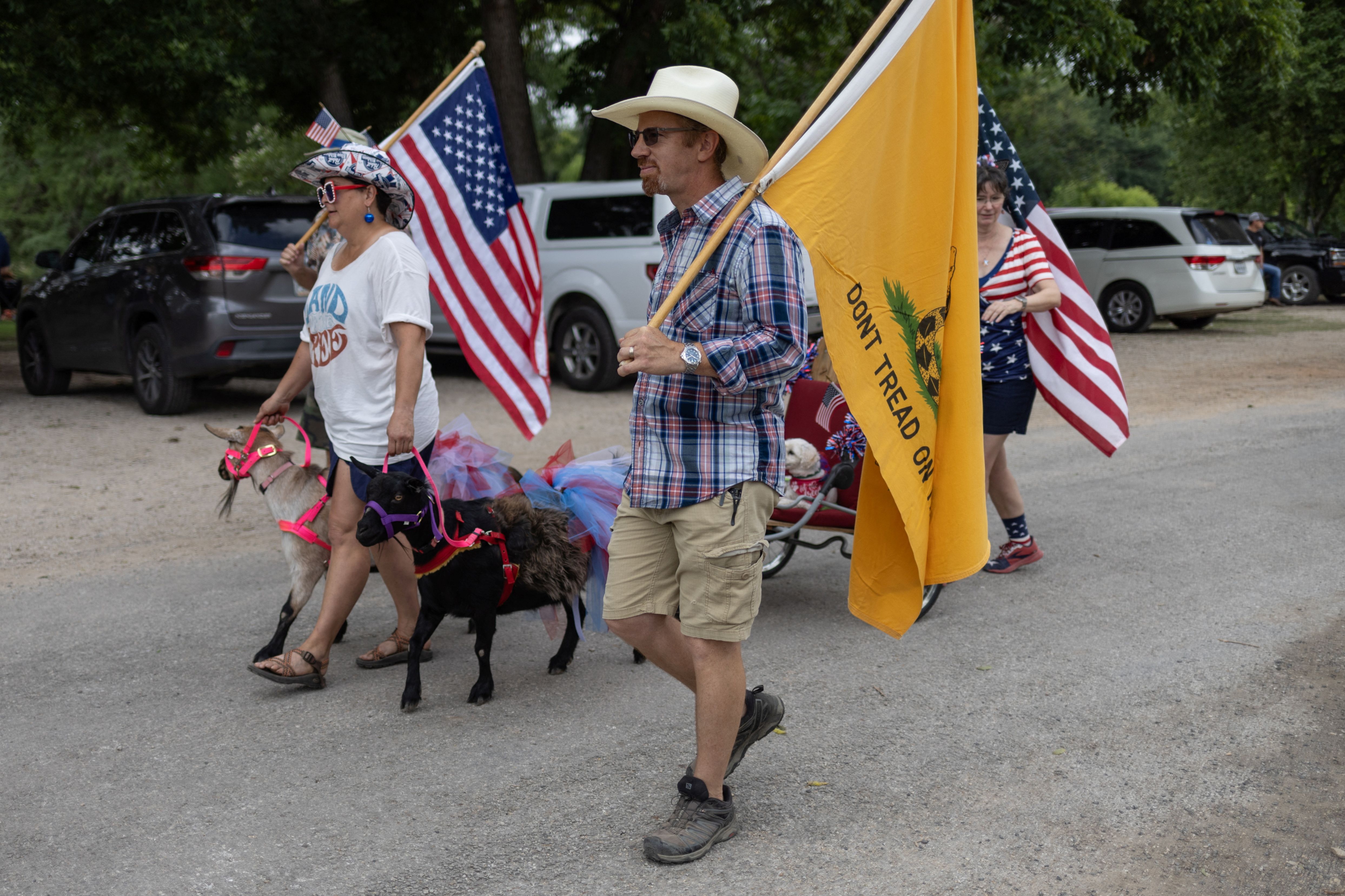 Steve Baine carries the Gadsden flag as wife Jennifer Baine leads her three-year-old Nigora goats Pancake and Patti at the 28th annual Pet Parade during Fourth of July Independence Day celebrations in Bandera, Texas on July 4, 2024. (Photo by Adrees Latif/Reuters)
