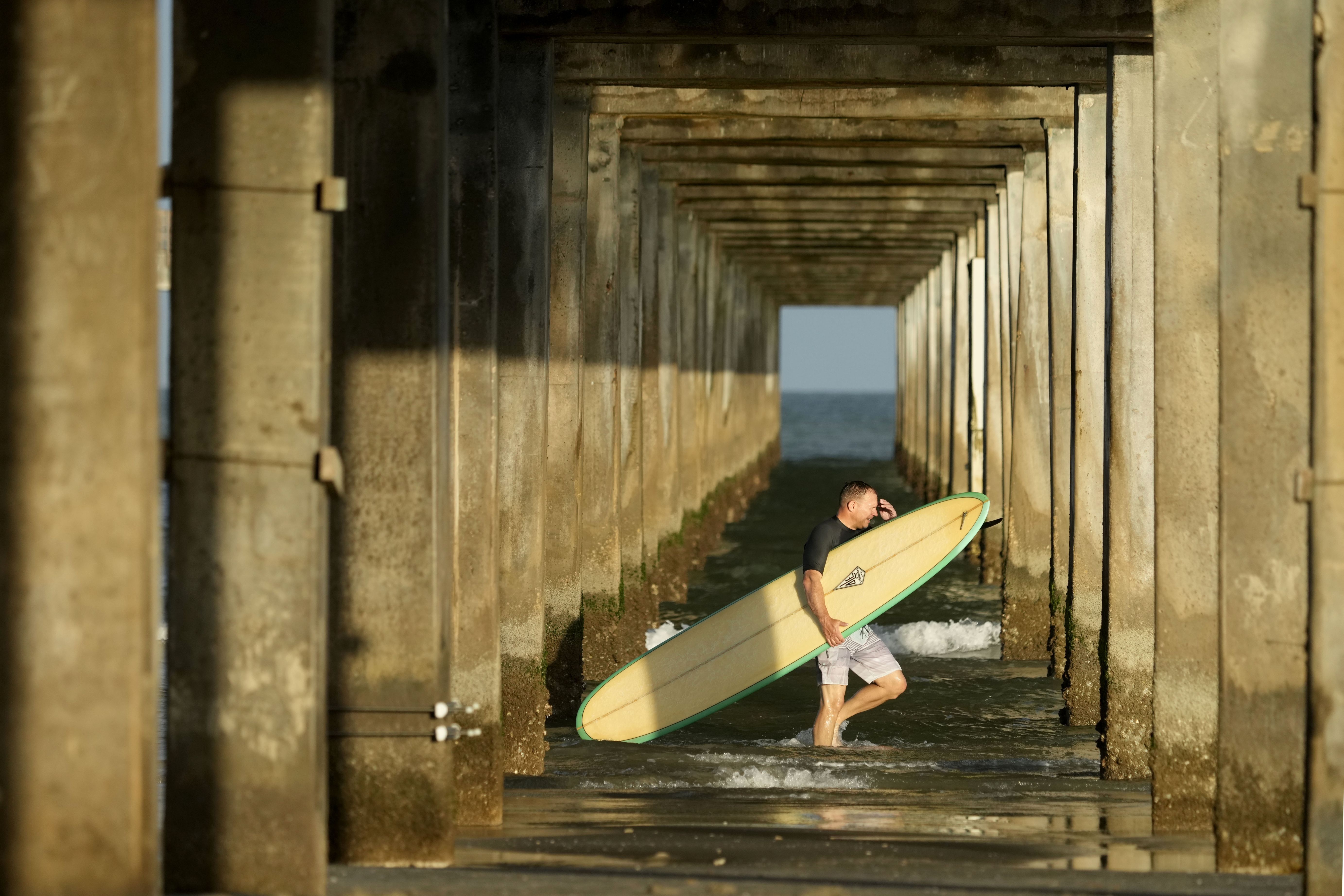 A surfer passes under a pier after spending time in the water ahead of Beryl's arrival, Saturday, July 6, 2024, in Port Aransas, Texas. (Photo y Eric Gay/AP Photo)