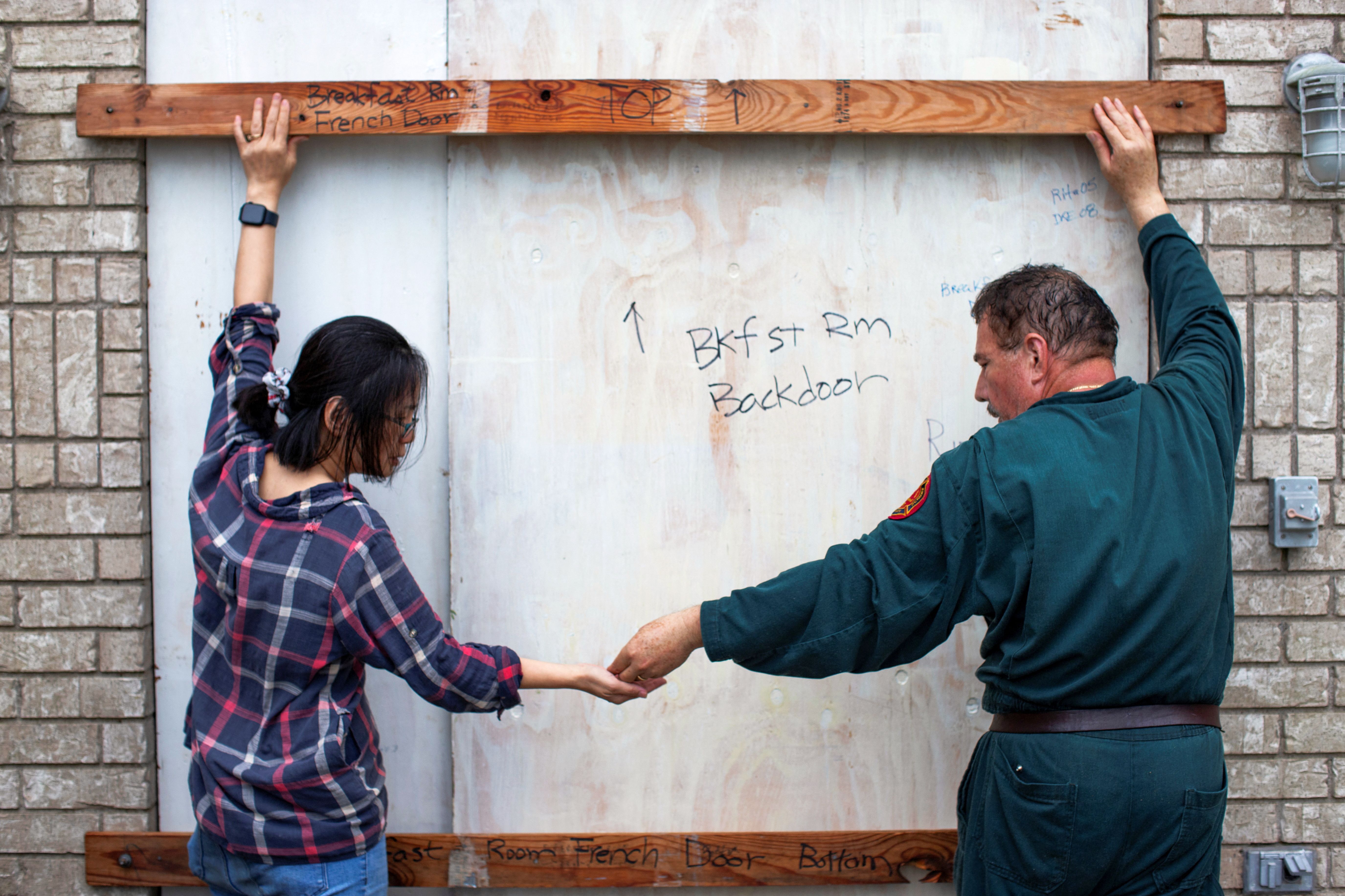 Shan Mei Martinez and Mario Martinez attach door braces to secure their back bay-facing door, as residents prepare for the arrival of Hurricane Beryl in Port Lavaca, Texas on July 7, 2024. (Photo by Kaylee Greenlee Beal/Reuters)