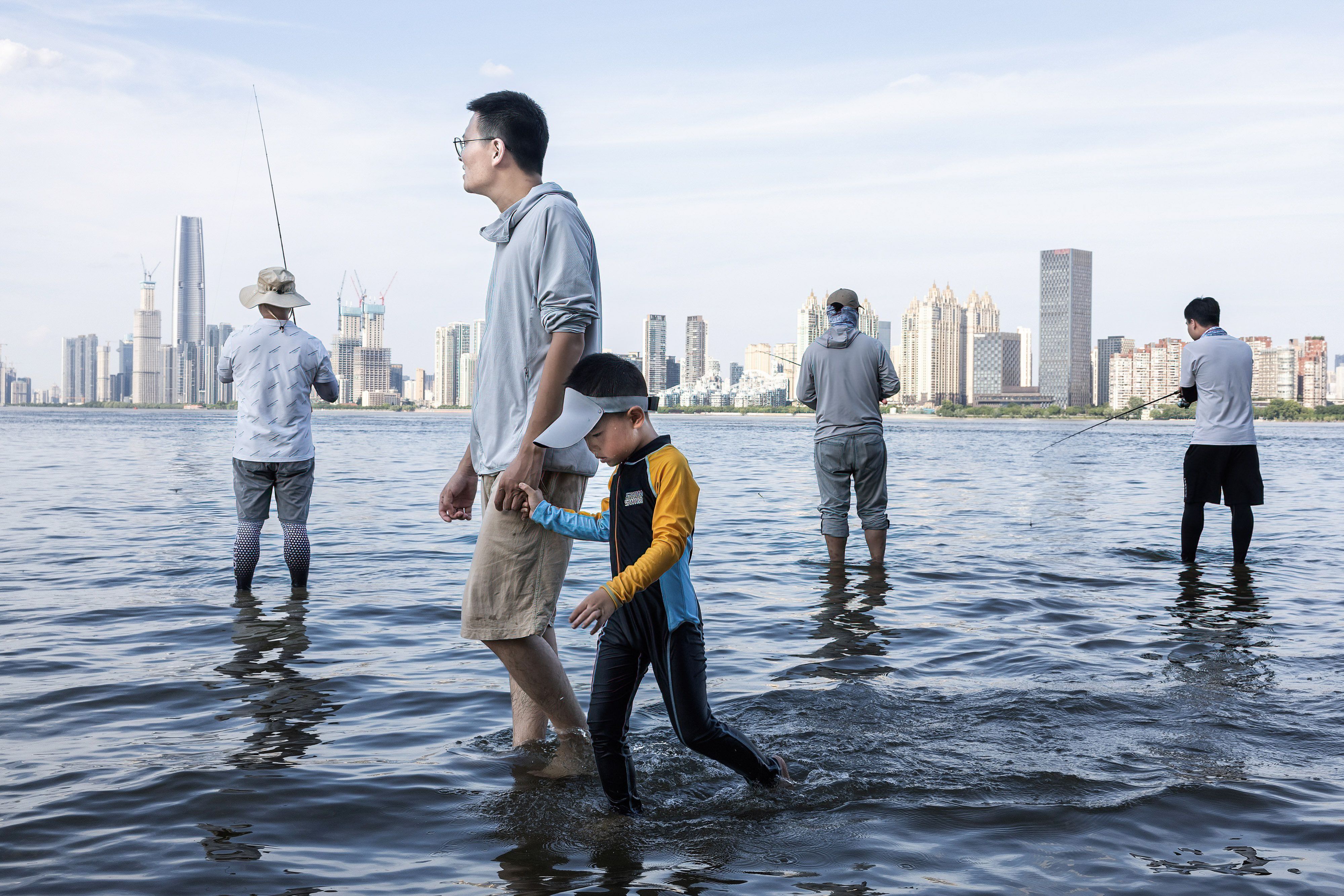 A man and his kid walk through the flooded Hankou Riverbank Park of the Yangtze River on July 7, 2024. Water levels in sections of the middle and lower reaches of the Yangtze River – China's longest river – below the estuary of Dongting Lake, have exceeded the warning mark, according to the Ministry of Water Resources. (Photo by Ren Yong/SOPA Images/Rex Features/Shutterstock)