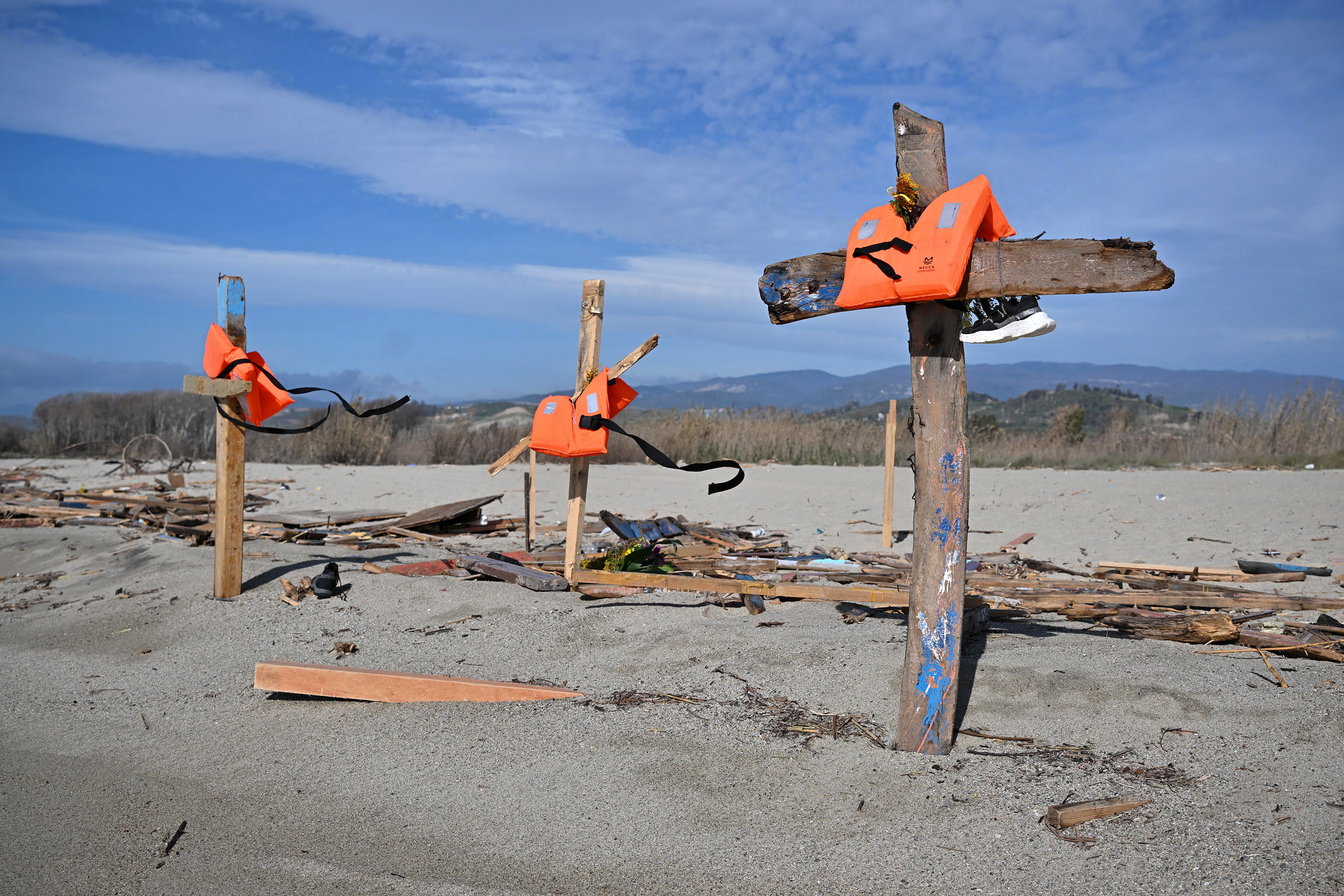 Crosses to pay homage to the victims of the Steccato di Cutro shipwreck, in Crotone, Italy, 09 March 2023. The Italian government will hold on the day a cabinet meeting in Cutro, where at least 72 migrants died in a tragic shipwreck that took place on the coast of Steccato on 26 February. (Photo by Carmelo Imbesi/EPA)
