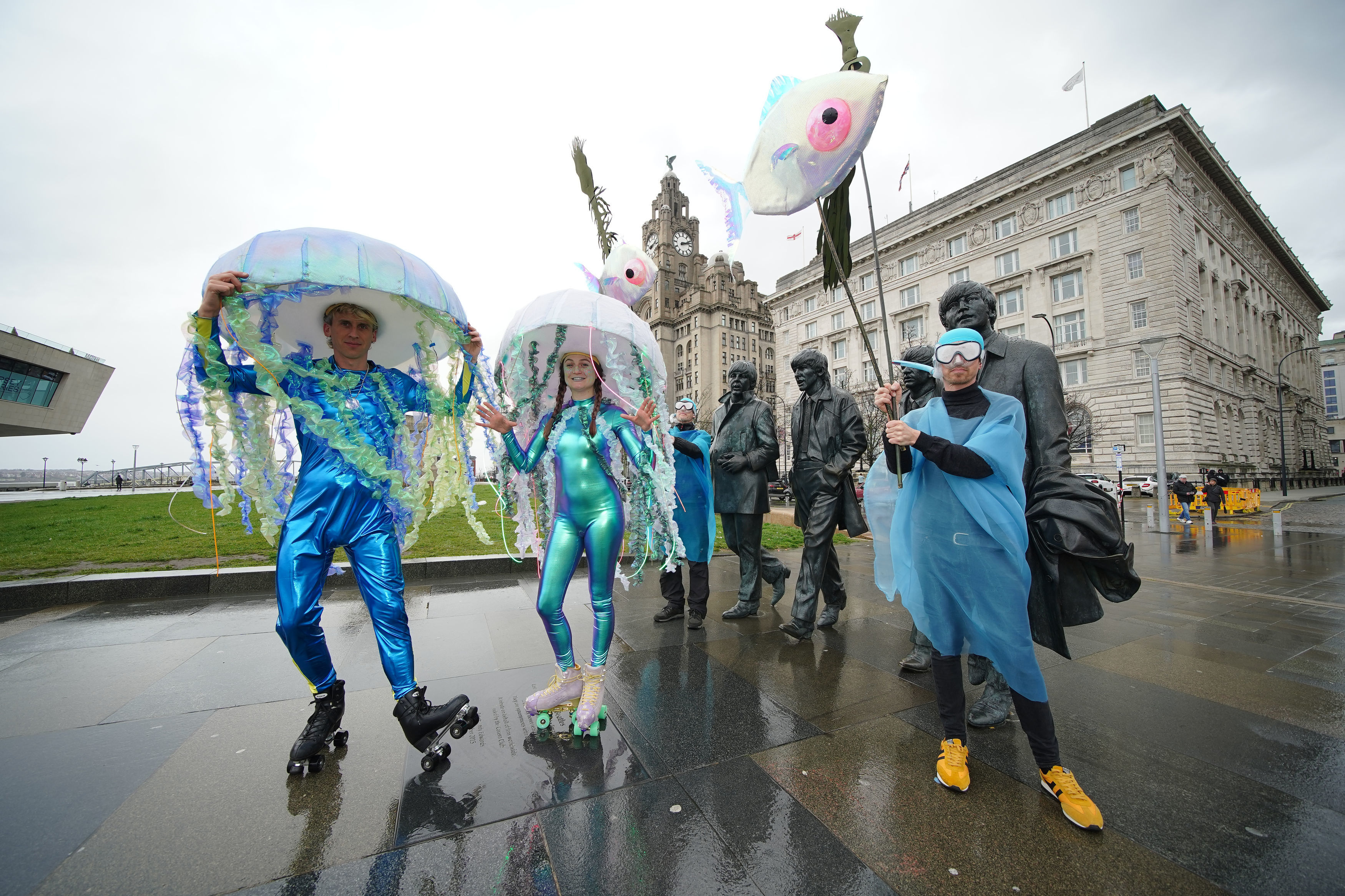 Performers dressed as jellyfish on roller skates skate around the Beatles statue at the launch of Eurovision EuroFestival at the British Music Experience in Liverpool on Tuesday, March 28, 2023. The two week festival, which will consist of 25 commissions – 19 of which are collaborations between UK and Ukrainian artists – will take over the city in the lead up to the Eurovision Song Contest as fans from across the world descend on Liverpool. (Photo by Peter Byrne/PA Images via Getty Images)