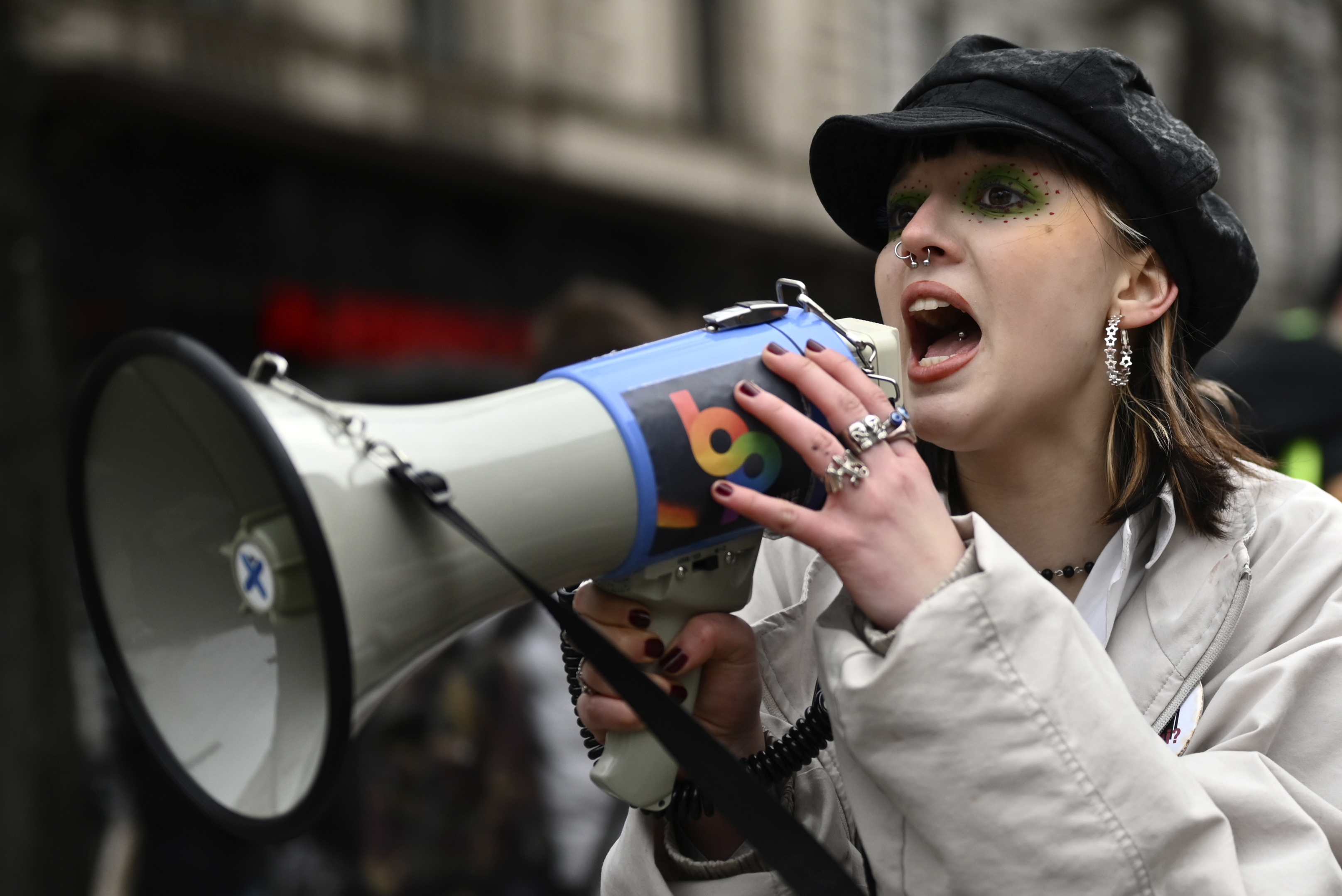 A woman shouts slogans during a march, marking the 175th anniversary of a failed 1848 uprising, in Budapest, Hungary, Wednesday, March 15, 2023. A “freedom march” was organized by dozens of civic organizations who are calling for greater social solidarity and an end to what they call intimidation from Viktor Orban's government. (Photo by Denes Erdos/AP Photo)