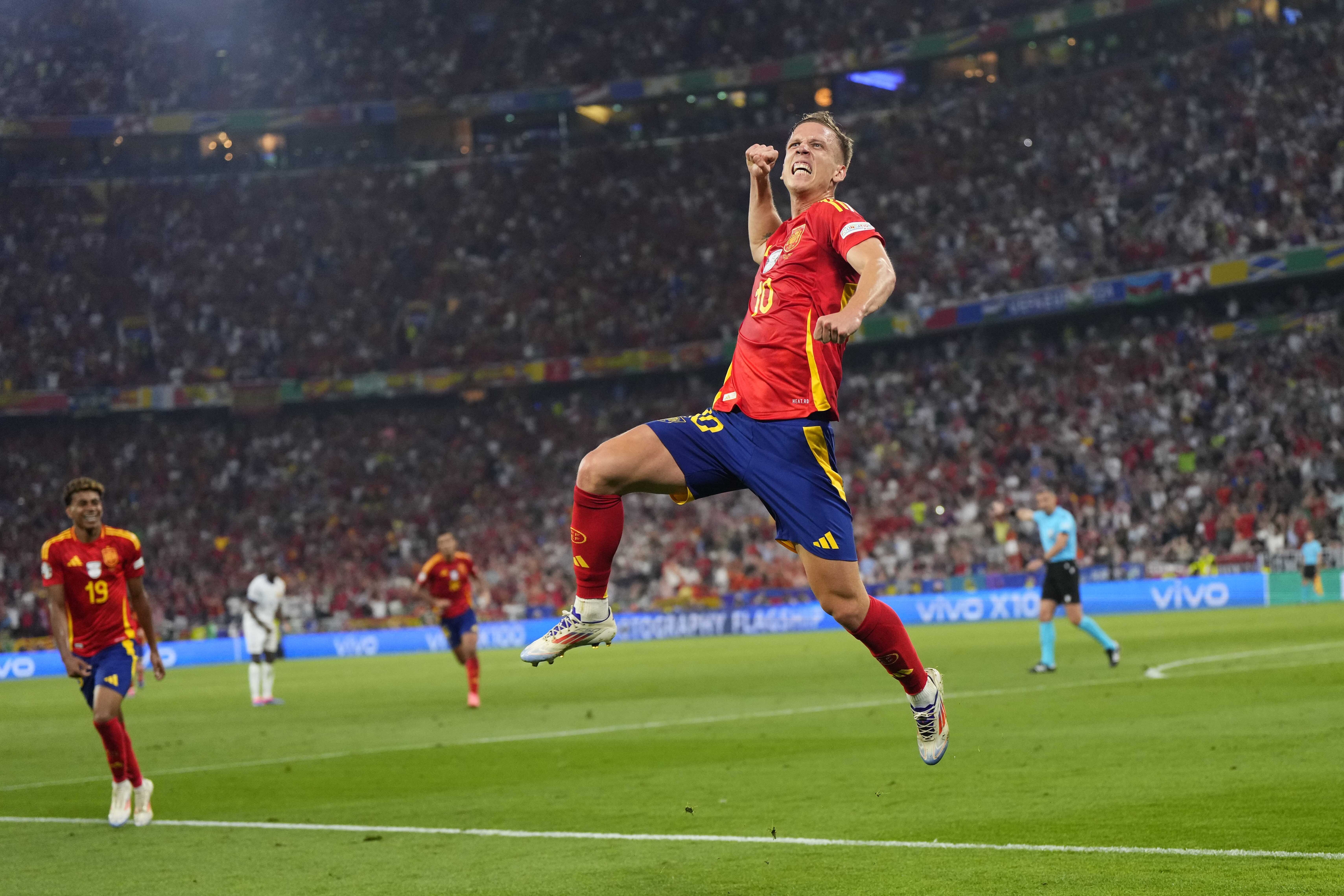 Spain's Dani Olmo celebrates after scoring his side's second goal during a semifinal match between Spain and France at the Euro 2024 soccer tournament in Munich, Germany, Tuesday, July 9, 2024. (Photo by Manu Fernandez/AP Photo)