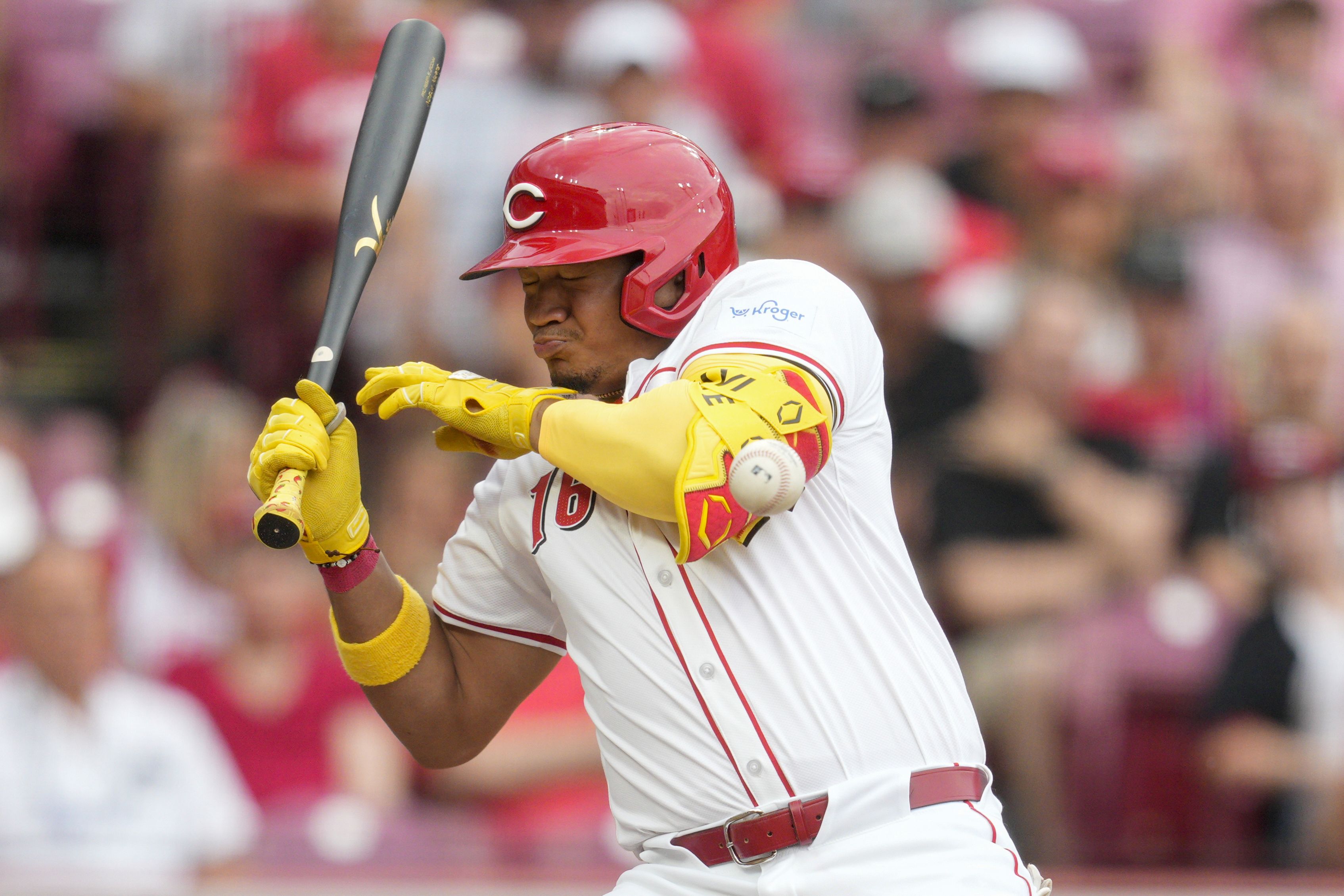 Cincinnati Reds' Noelvi Marte is hit by a pitch during the second inning of a baseball game against the Colorado Rockies, Tuesday, July 9, 2024, in Cincinnati. (Photo by Jeff Dean/AP Photo)