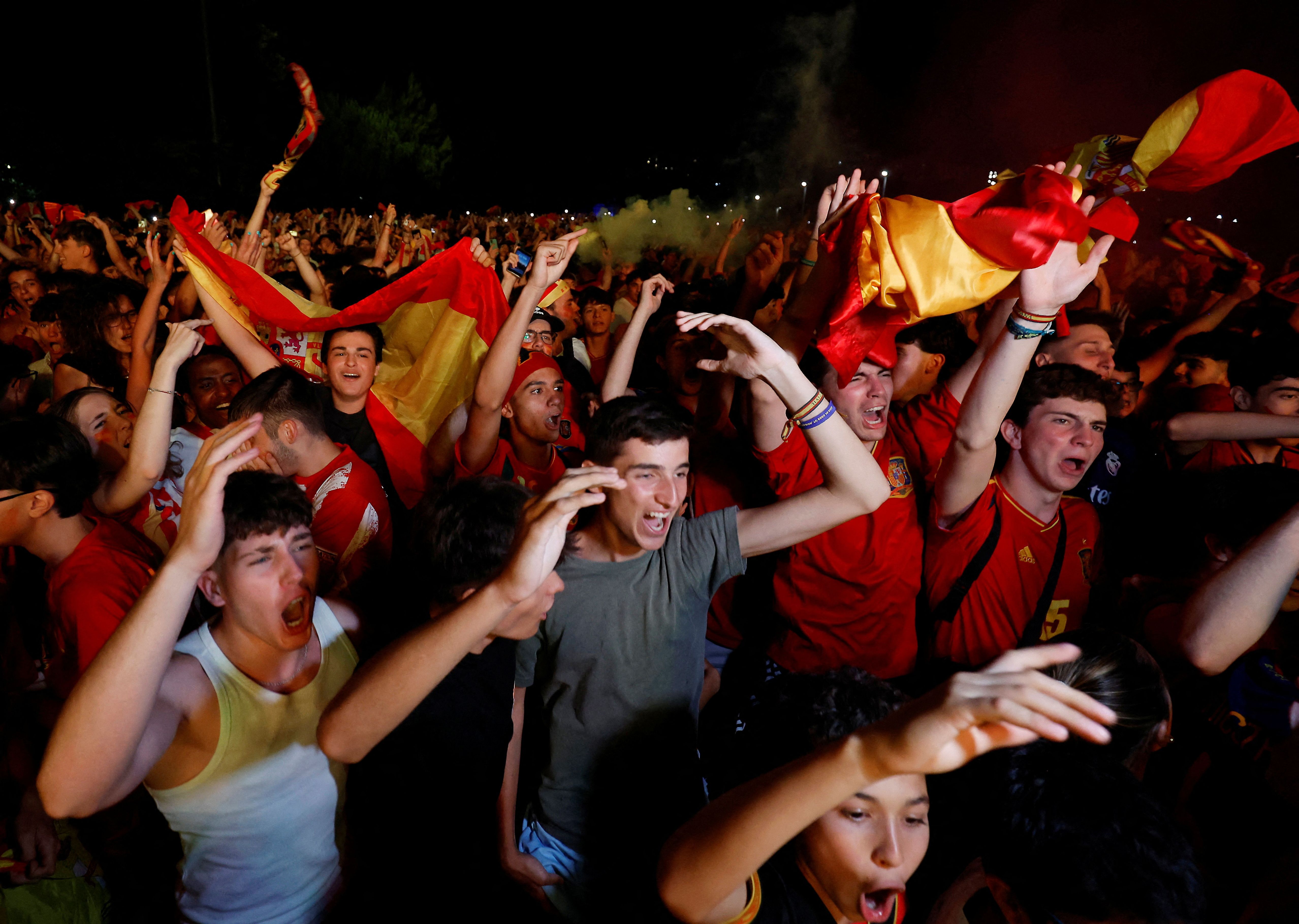 Fans in Madrid celebrate after their Euro semi final match against France on July 9, 2024. (Photo by Juan Medina/Reuters)