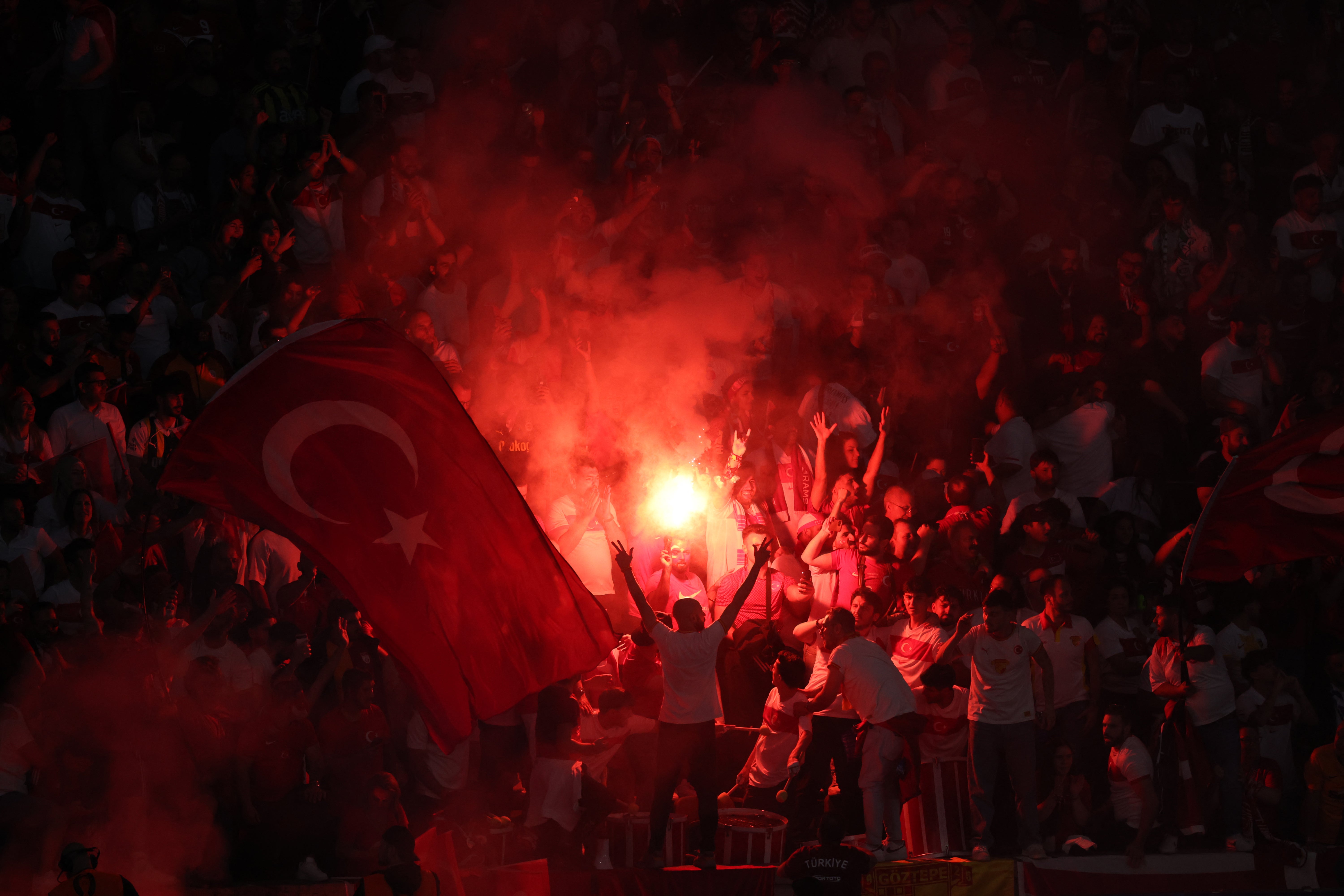 Turkey's supporters light smoke flares during the UEFA Euro 2024 quarter-final football match between the Netherlands and Turkey at the Olympiastadion Berlin in Berlin on July 6, 2024. (Photo by Ronny Hartmann/AFP Photo)