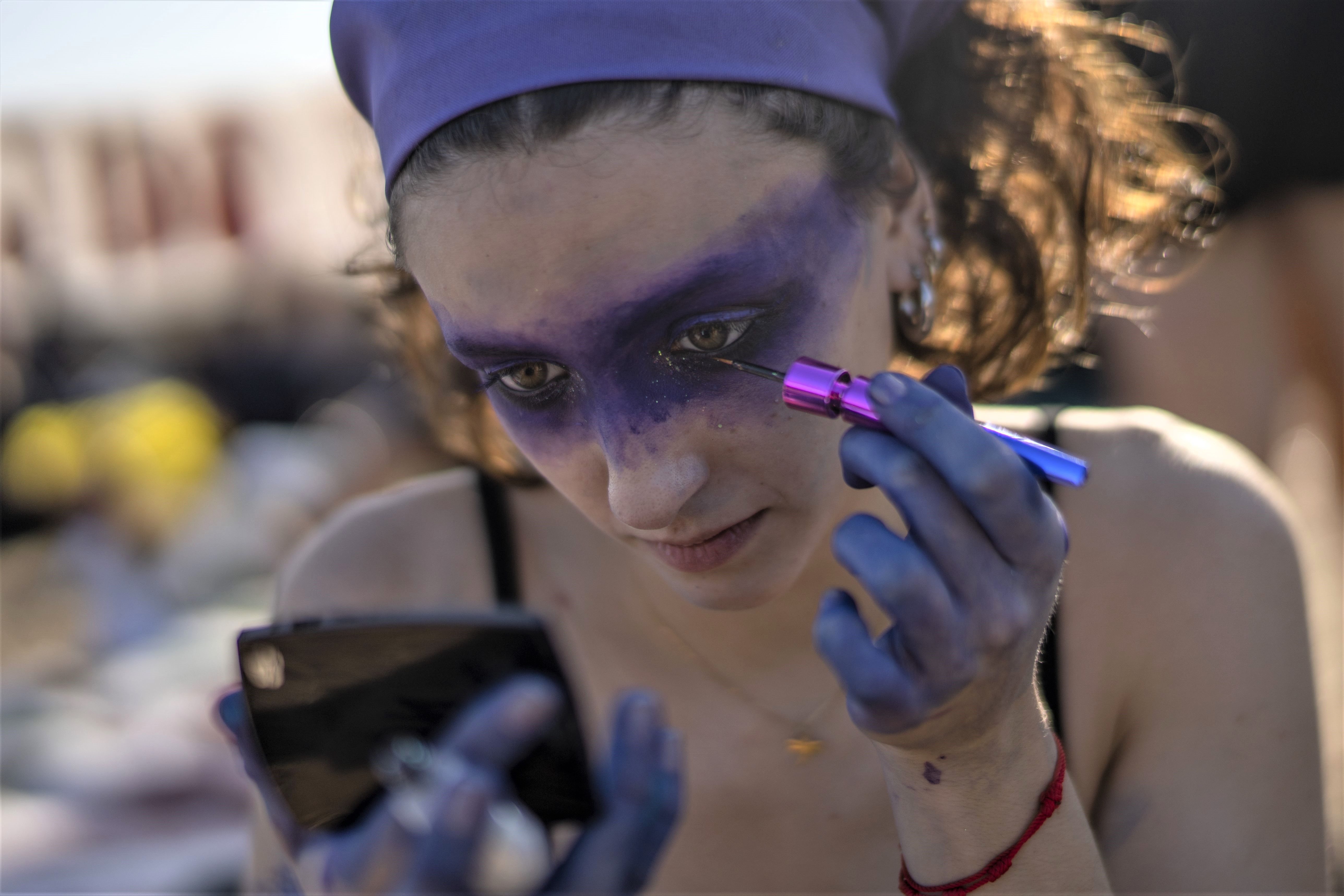 A woman prepares to participate in a rally to mark International Women's Day in Montevideo, Uruguay, Wednesday, March 8, 2023. (Phoot by Matilde Campodonico/AP Photo)
