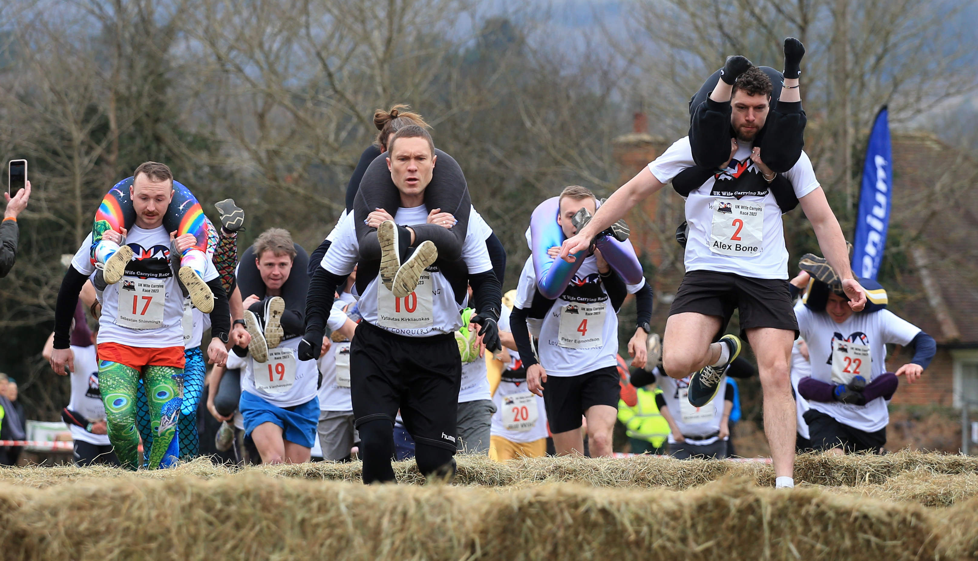 Marriages were put to the test over the weekend at the annual UK Wife Carrying Race in Dorking, Surrey, United Kingdom on March 5, 2023. The Lithuanian pair of Vytautas and Neringa Kirkliauskiene won. (Photo by Peter Tarry/The Times)