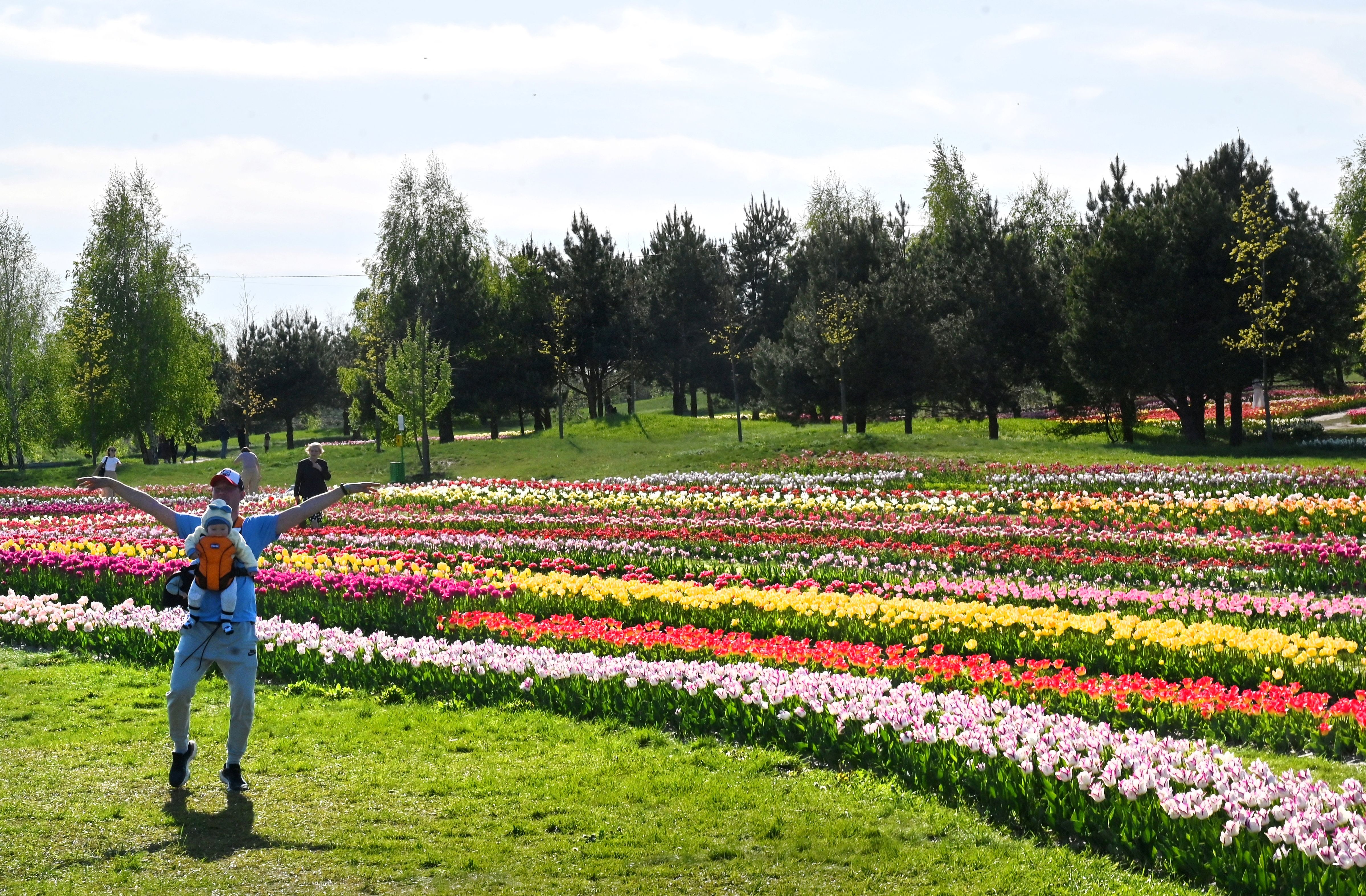 A man holding a baby poses for a photo with blooming tulips in a park outside Kyiv on April 29, 2024, amid the Russian invasion of Ukraine. (Photo by Sergei Supinsky/AFP Photo)