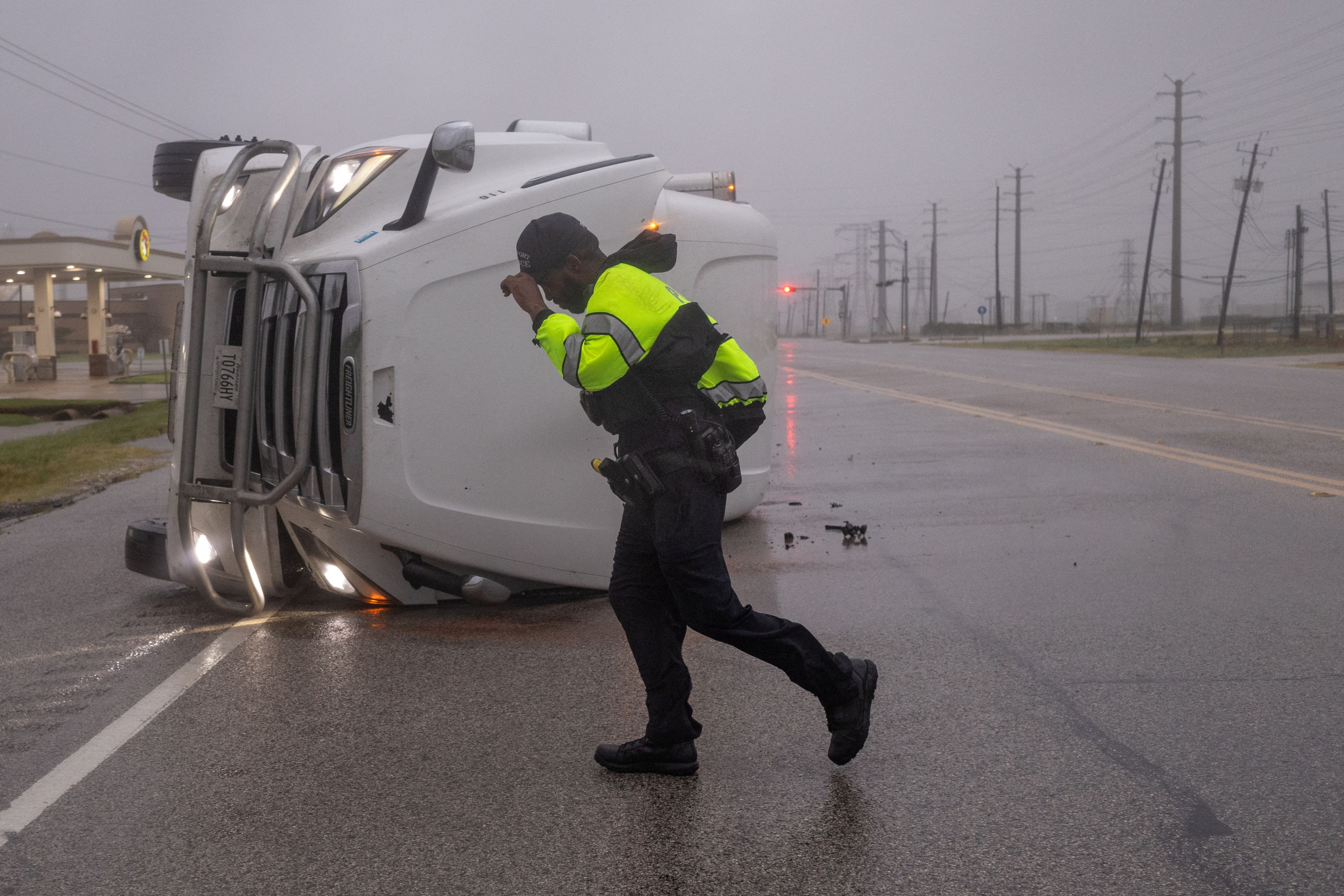 A police officer fights fierce winds from Hurricane Beryl as he searches for occupants of an overturned semi-trailer truck in Freeport, Texas, U.S., July 8, 2024. (Photo by Adrees Latif/Reuters)