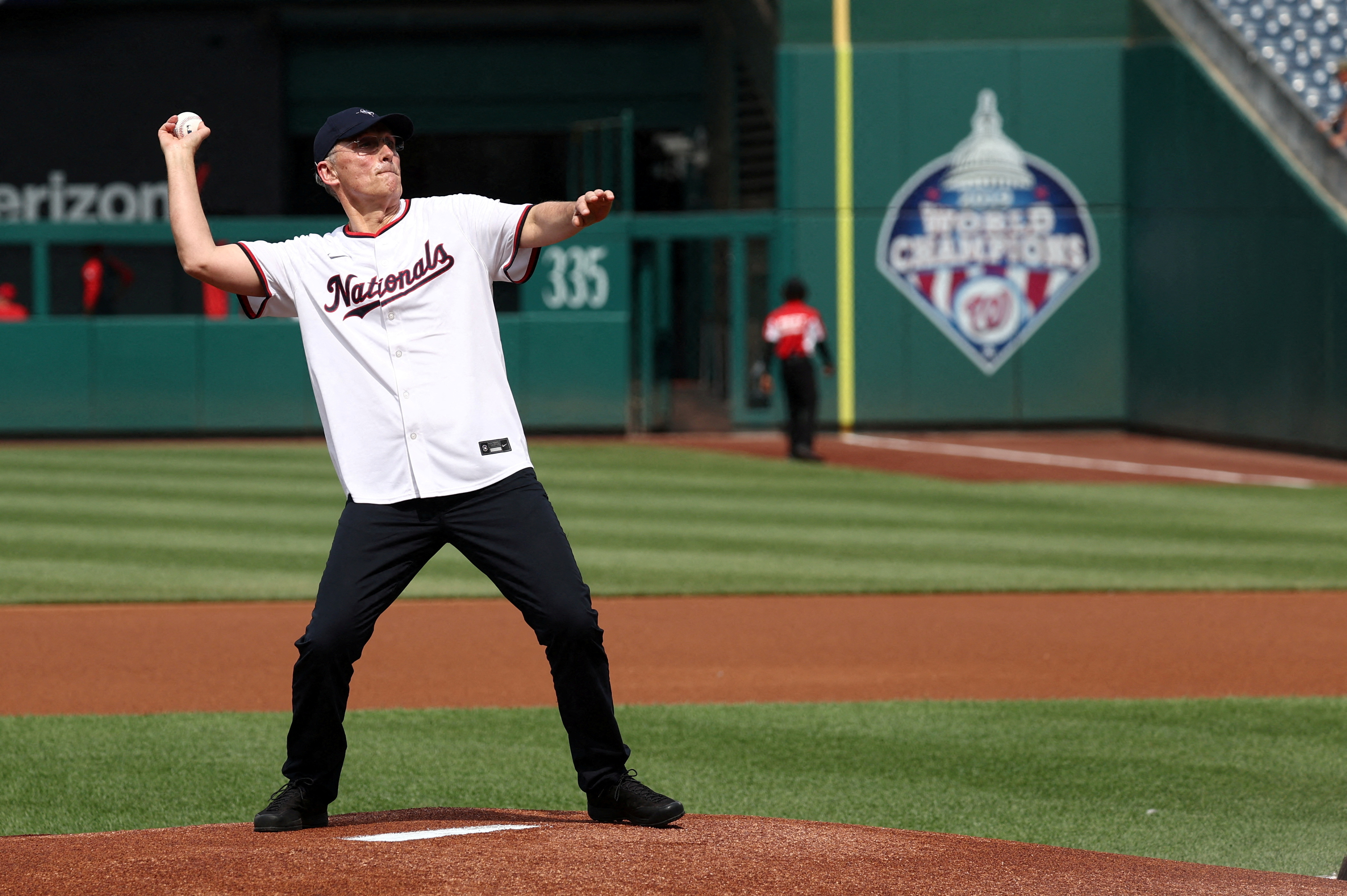 NATO Secretary-General Jens Stoltenberg throws the ceremonial first pitch to celebrate "NATO day" before the start of the game between the Washington Nationals and the St. Louis Cardinals at Nationals Park in Washington on July 8, 2024. (Photo by Yves Herman/Reuters)