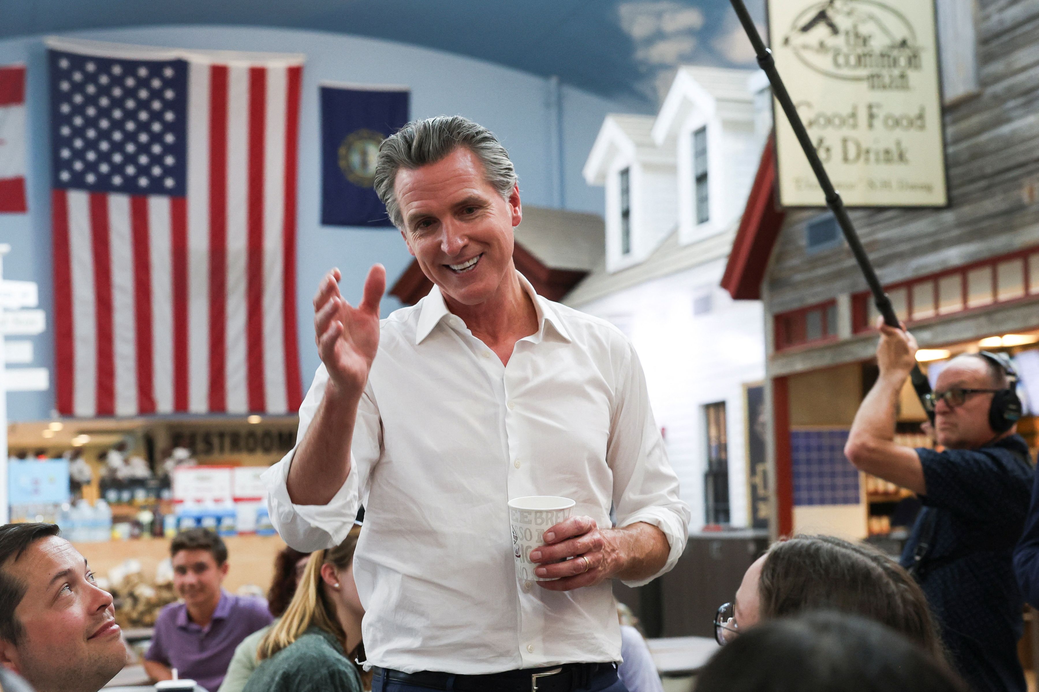 California Governor Gavin Newsom, who is in New Hampshire to attend a fundraising event for U.S. President Joe Biden's campaign, greets people at the Common Man Roadside Cafe & Deli in Hooksett, New Hampshire on July 8, 2024. (Photo by Reba Saldanha/Reuters)