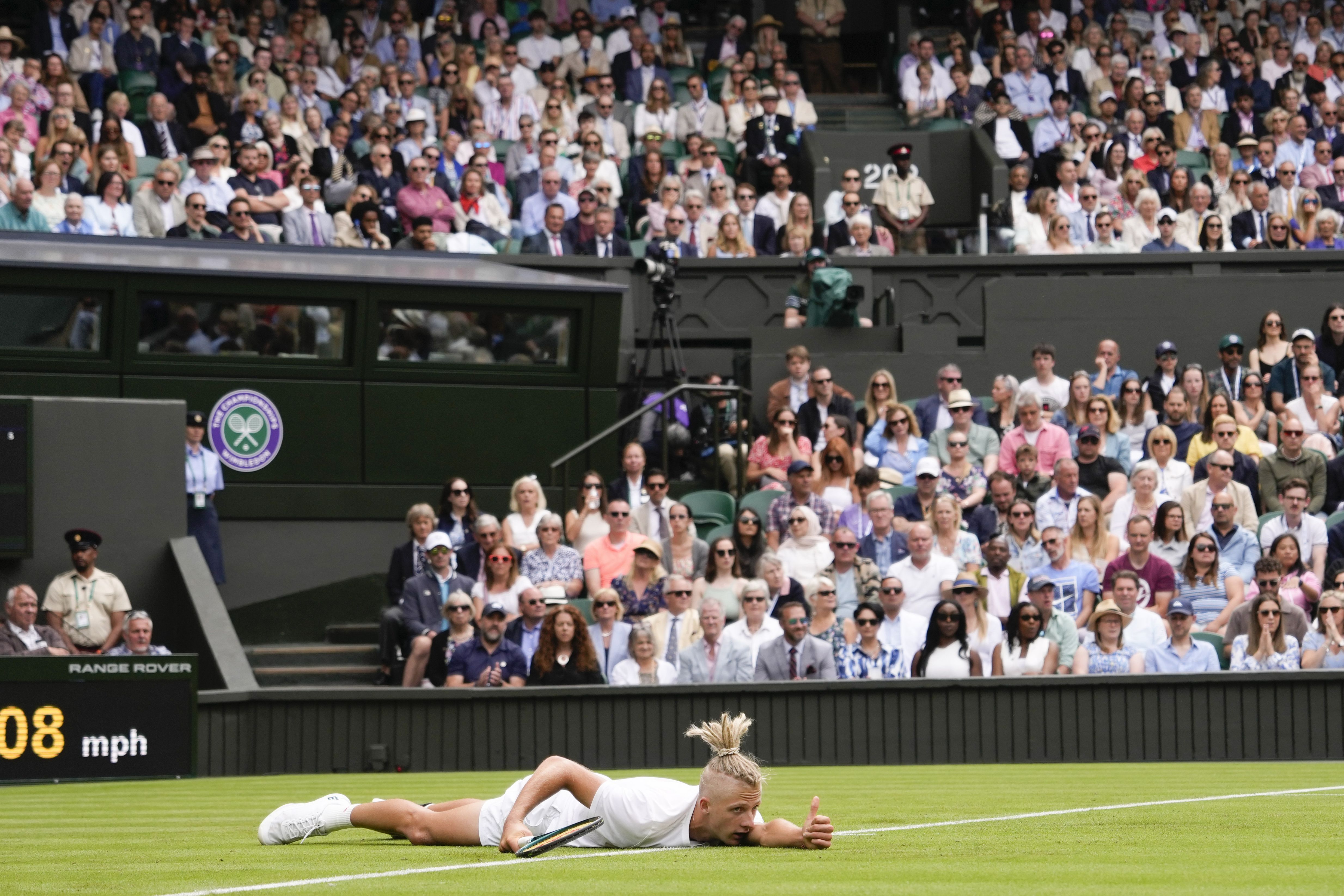 Mark Lajal of Estonia reacts as he lies on the court during his first round match against Carlos Alcaraz of Spain at the Wimbledon tennis championships in London, Monday, July 1, 2024. (Photo by Alberto PezzaliAP Photo)