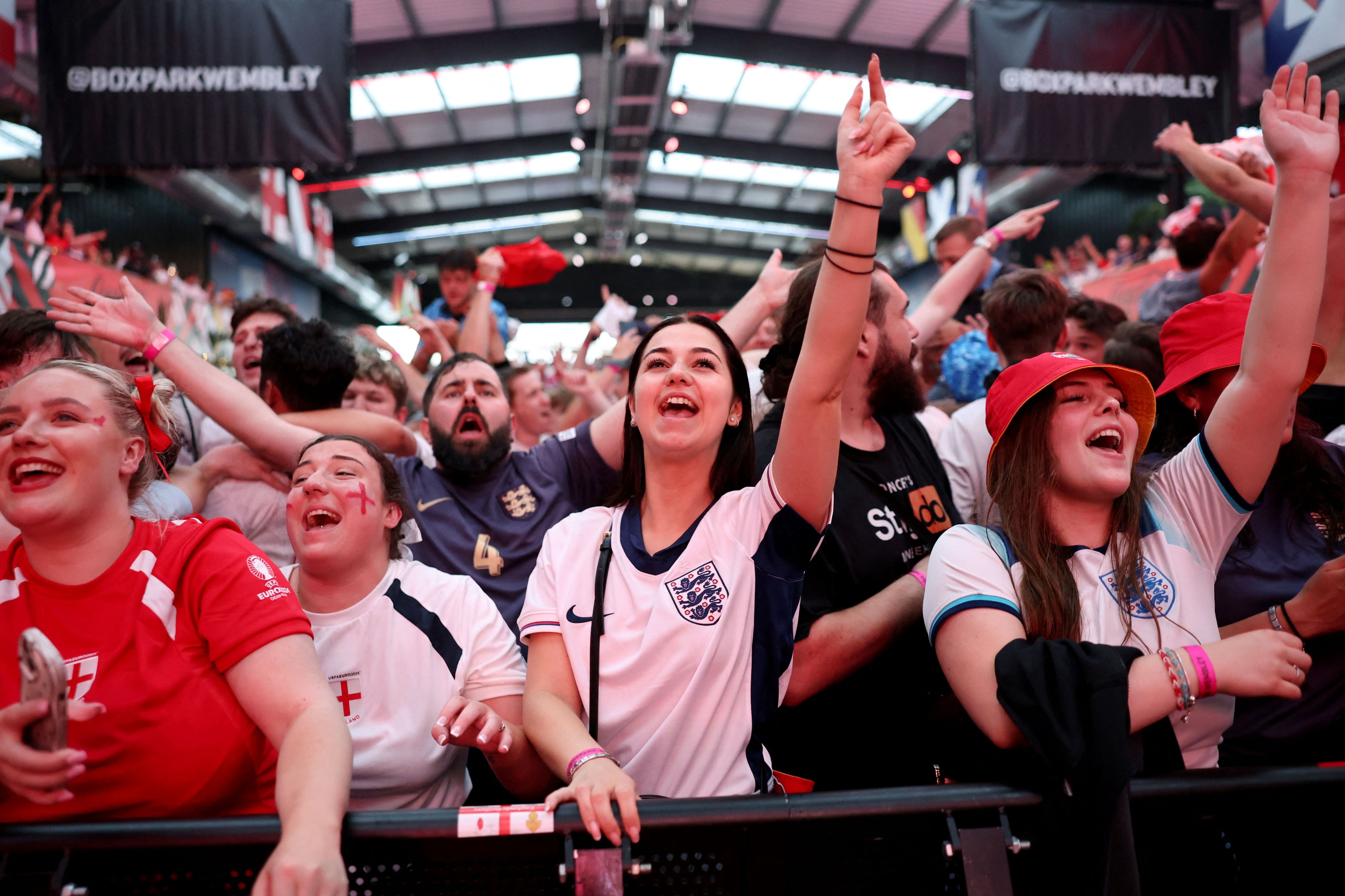England fans celebrating England's penalty win against Switzerland at BOXPARK Wembley in London, Britain on July 6, 2024. (Photo by David Klein/Reuters)