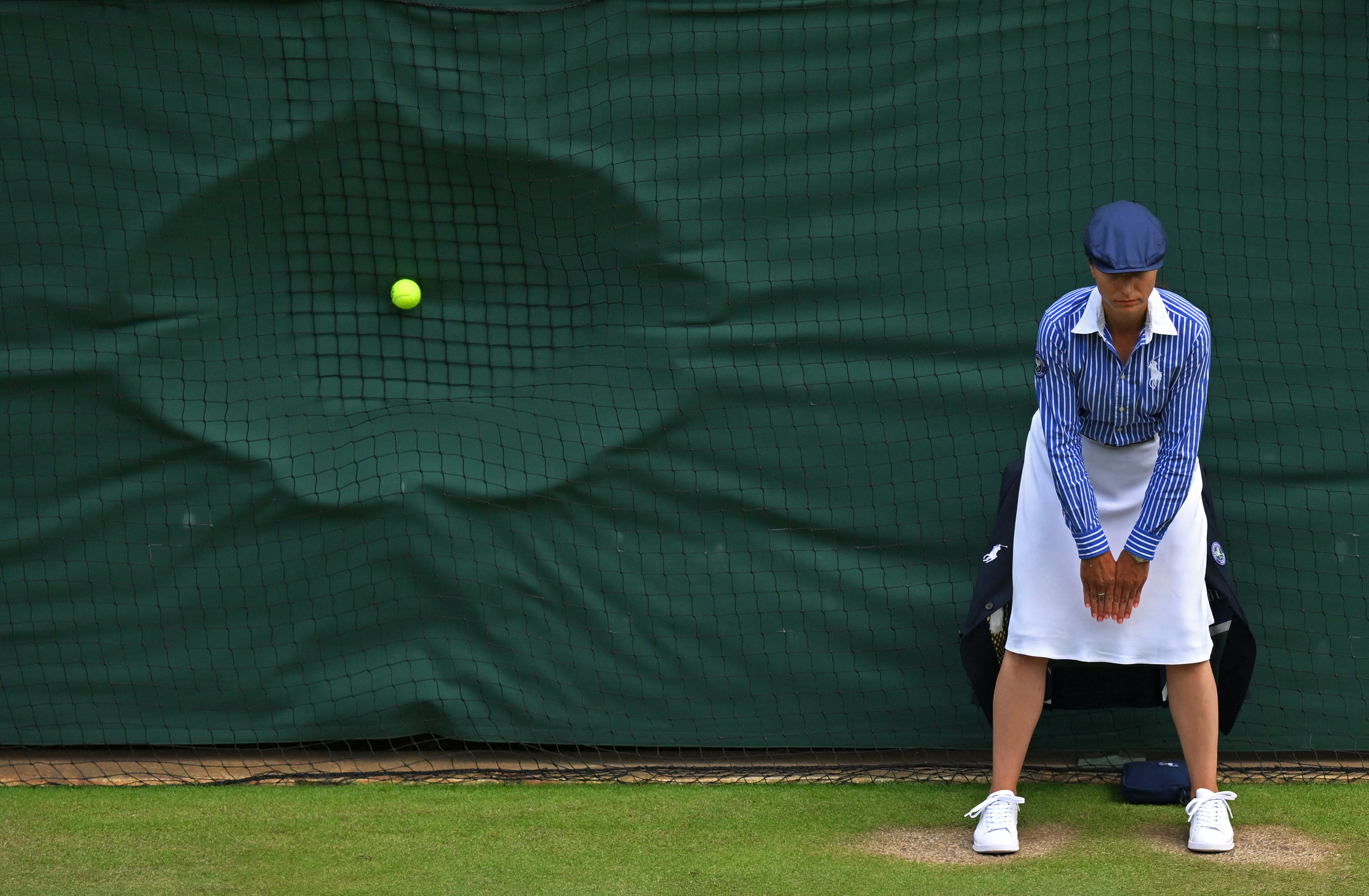 A line judge stands in position as a ball hits the back netting after a serve during the men's doubles semi-final tennis match between Britain's Henry Patten and Finland's Harri Heliövaara, and New Zealand's Michael Venus and Britain's Neal Skupski, on the eleventh day of the 2024 Wimbledon Championships at The All England Lawn Tennis and Croquet Club in Wimbledon, southwest London, on July 11, 2024. (Photo by Andrej Isakovic/AFP Photo)