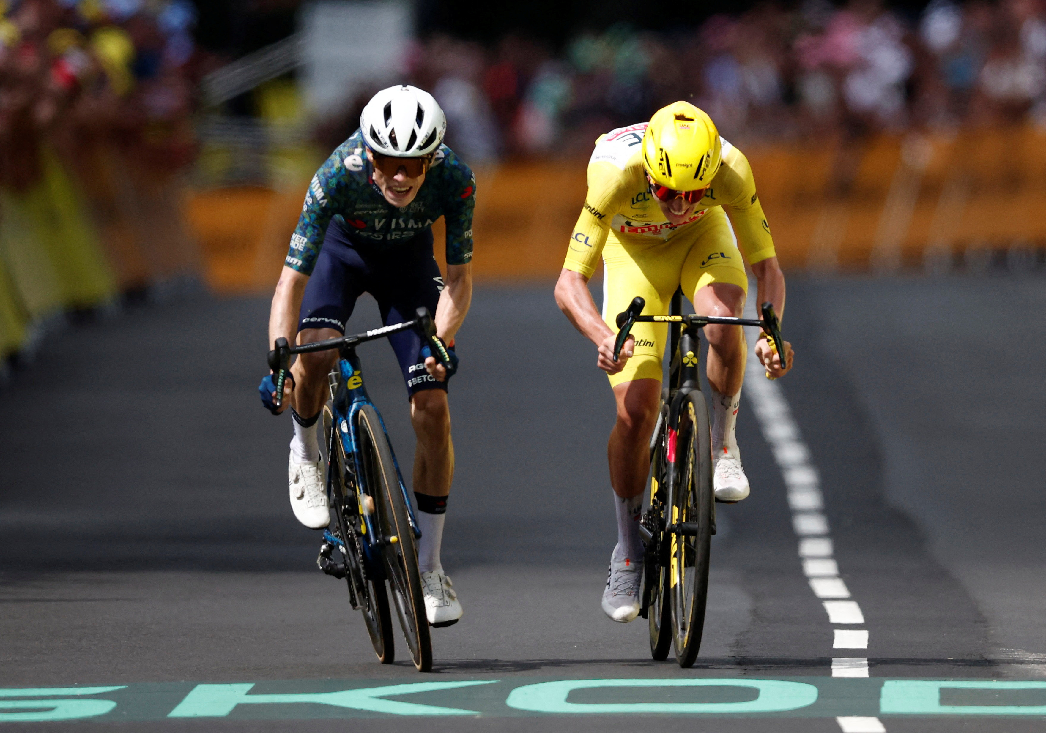 Team Visma | Lease a Bike's Jonas Vingegaard in action before winning stage 11 alongside second place UAE Team Emirates' Tadej Pogacar at the Tour de France on July 10, 2024. (Photo by Stephane Mahe/Reuters)