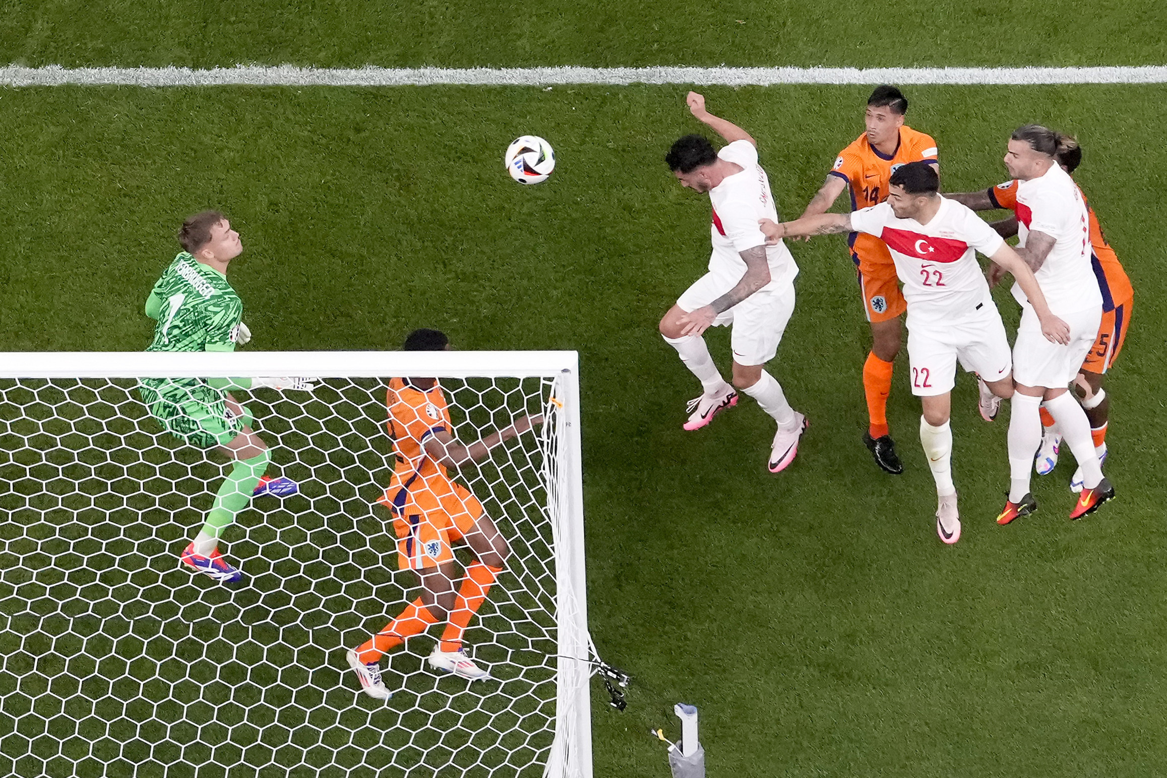 Turkey's Samet Akaydin, third left, scores the opening goal during a quarterfinal match between the Netherlands and Turkey at the Euro 2024 soccer tournament in Berlin, Germany, Saturday, July 6, 2024. (Phoot by Markus Schreiber/AP Photo)