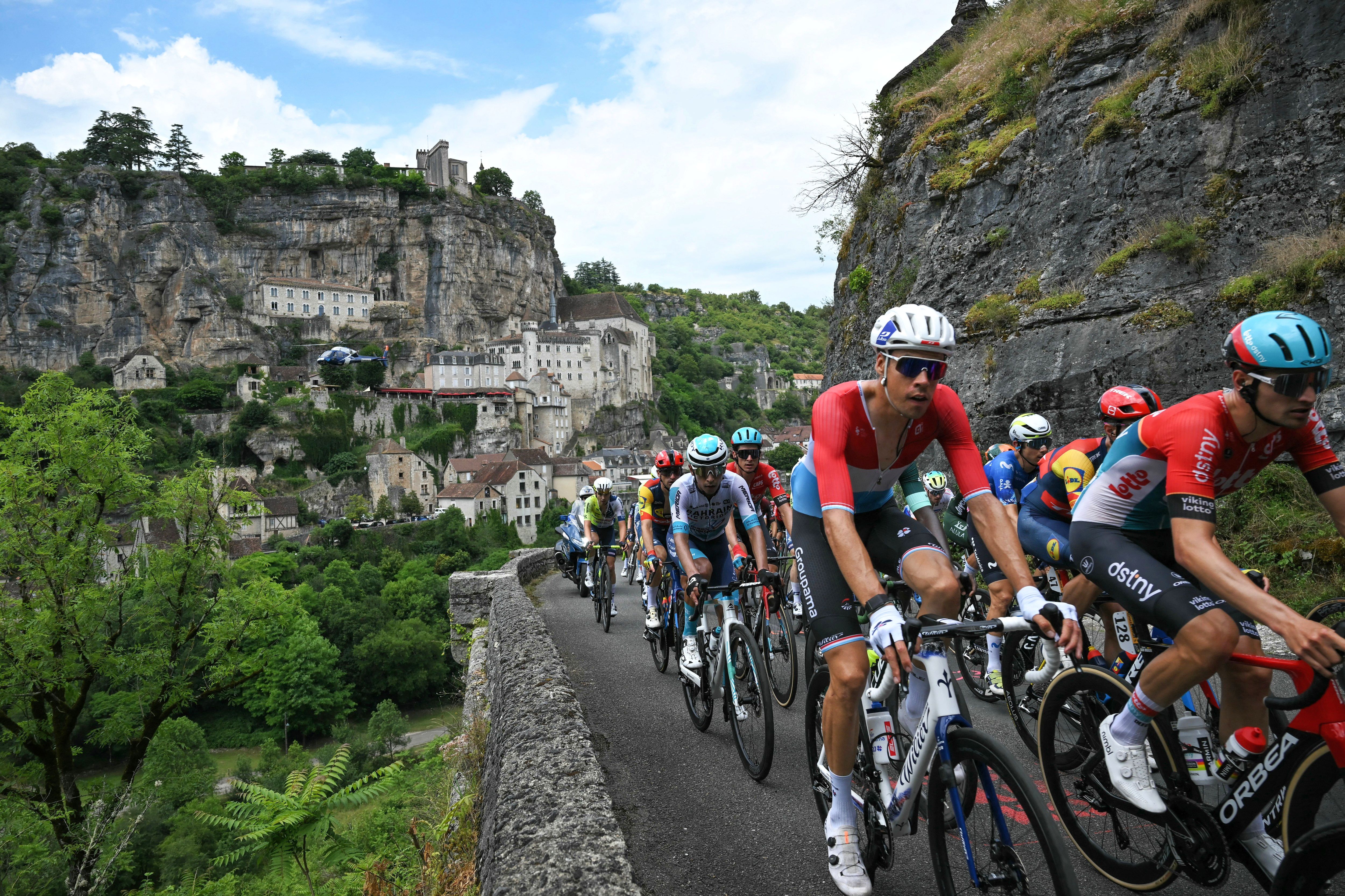 The pack of riders (peloton) cycles past the town of Rocamadour during the 12th stage of the 111th edition of the Tour de France cycling race, 203,6 km between Aurillac and Villeneuve-sur-Lot, southern central France, on July 11, 2024. (Photo by Marco Bertorello/AFP Photo)