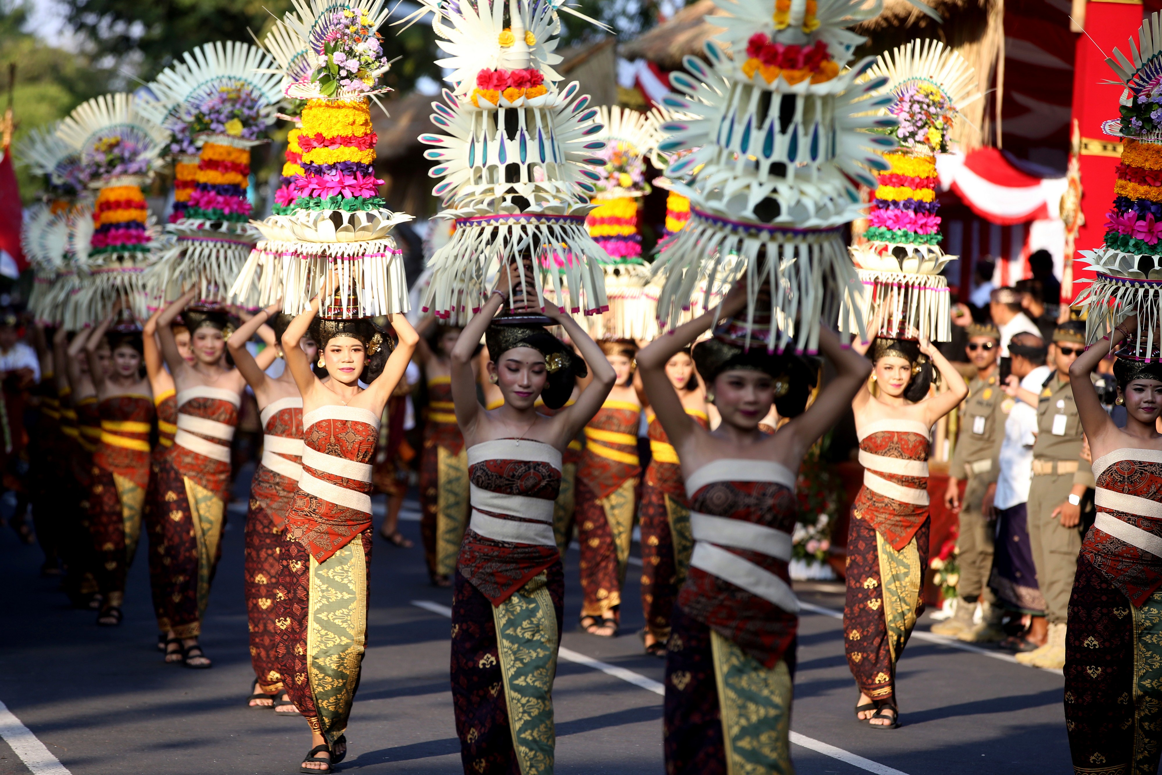 Women in traditional costume carry offerings during a parade at the opening of the Bali arts festival in Denpasar, Bali, Indonesia on Saturday, June 15, 2024. (Photo by Firdia Lisnawati/AP Photo)