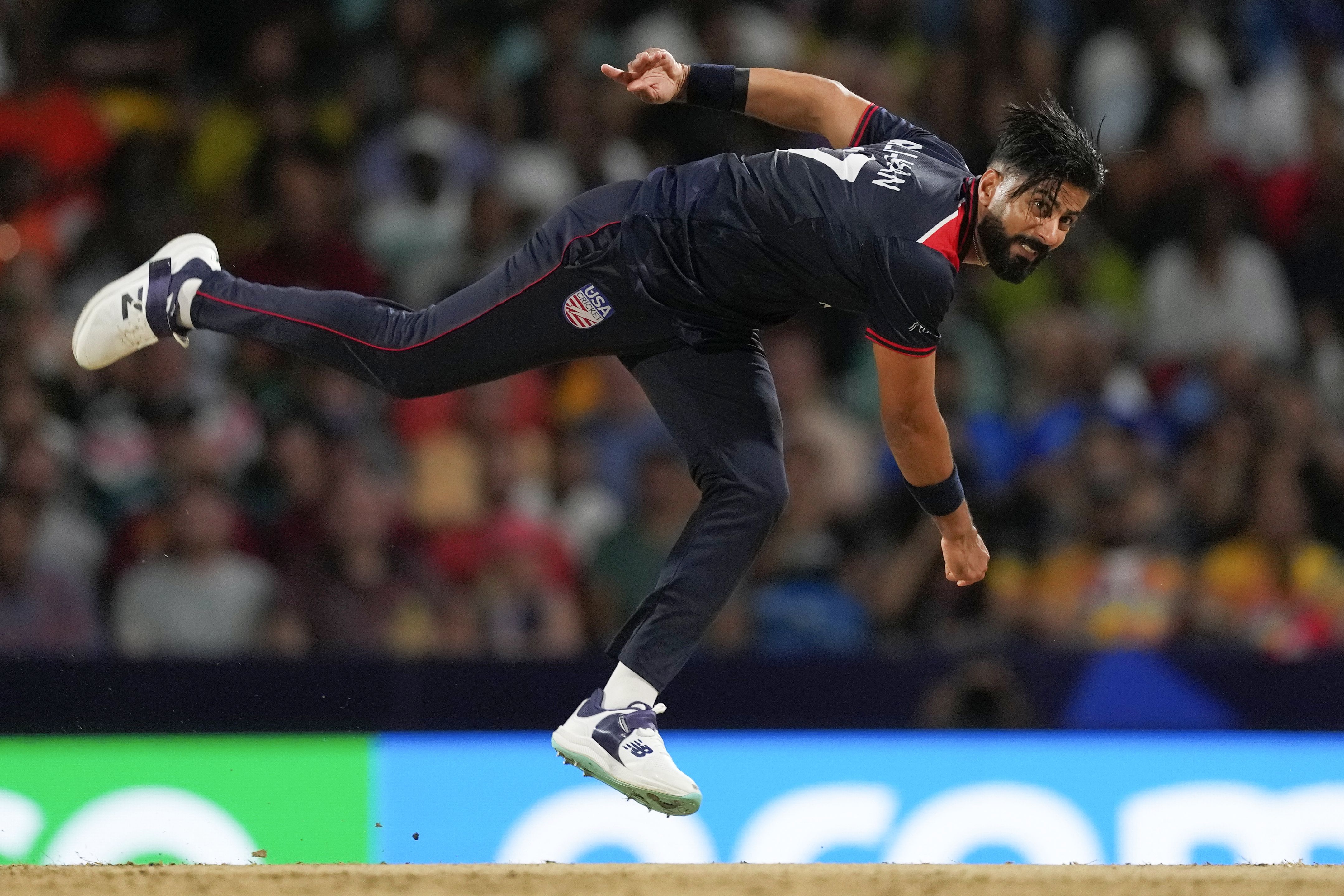 United States' Muhammad Ali-Khan bowls during the men's T20 World Cup cricket match between the USA and the West Indies at Kensington Oval, Bridgetown, Barbados, Friday, June 21, 2024. (Photo by Ricardo Mazalan/AP Photo)