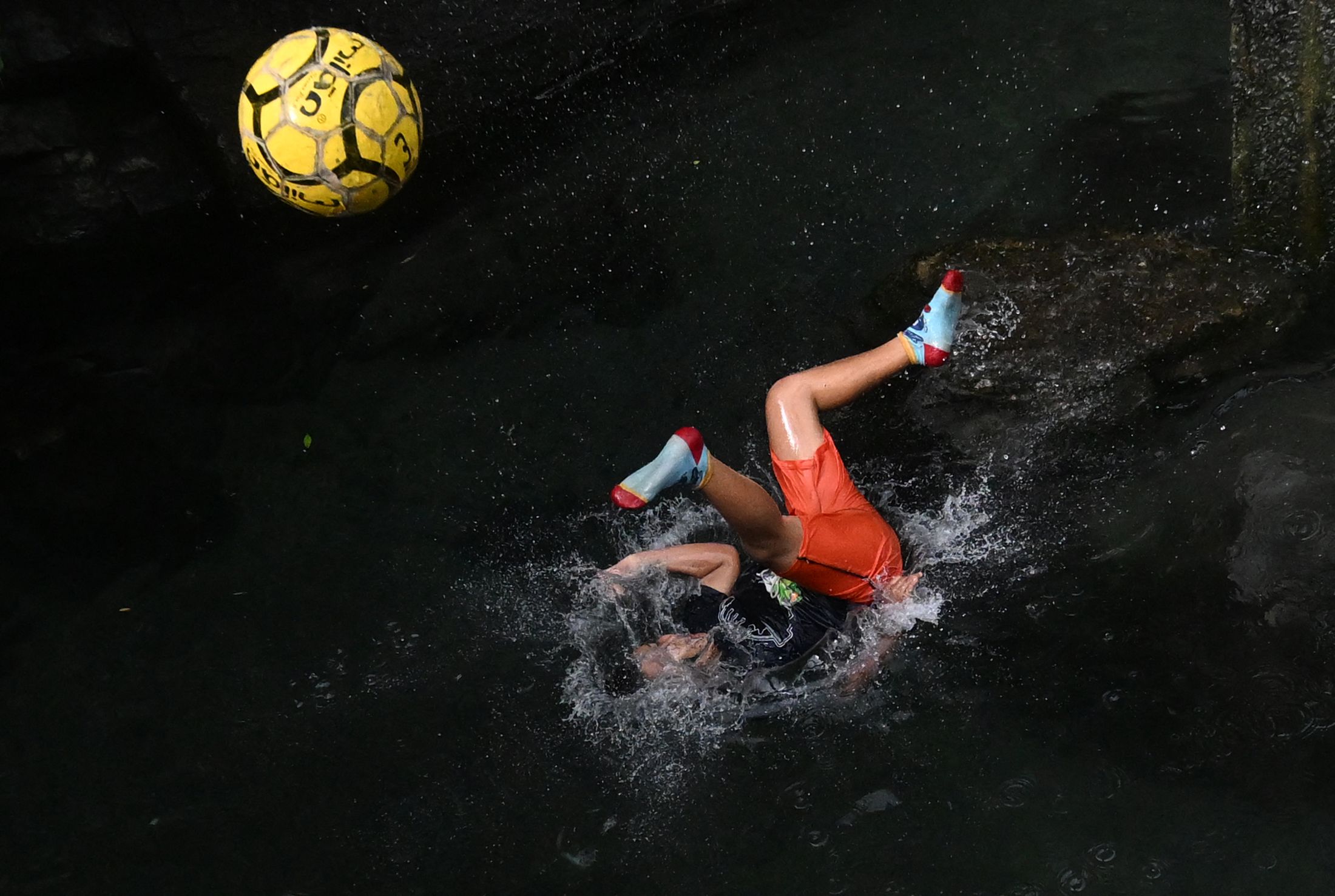 A boy plays with a football in the water during a warm day at the El Cuilio pool in San Salvador, El Salvador on June 28, 2024. (Photo by Marvin Recinos/AFP Photo)