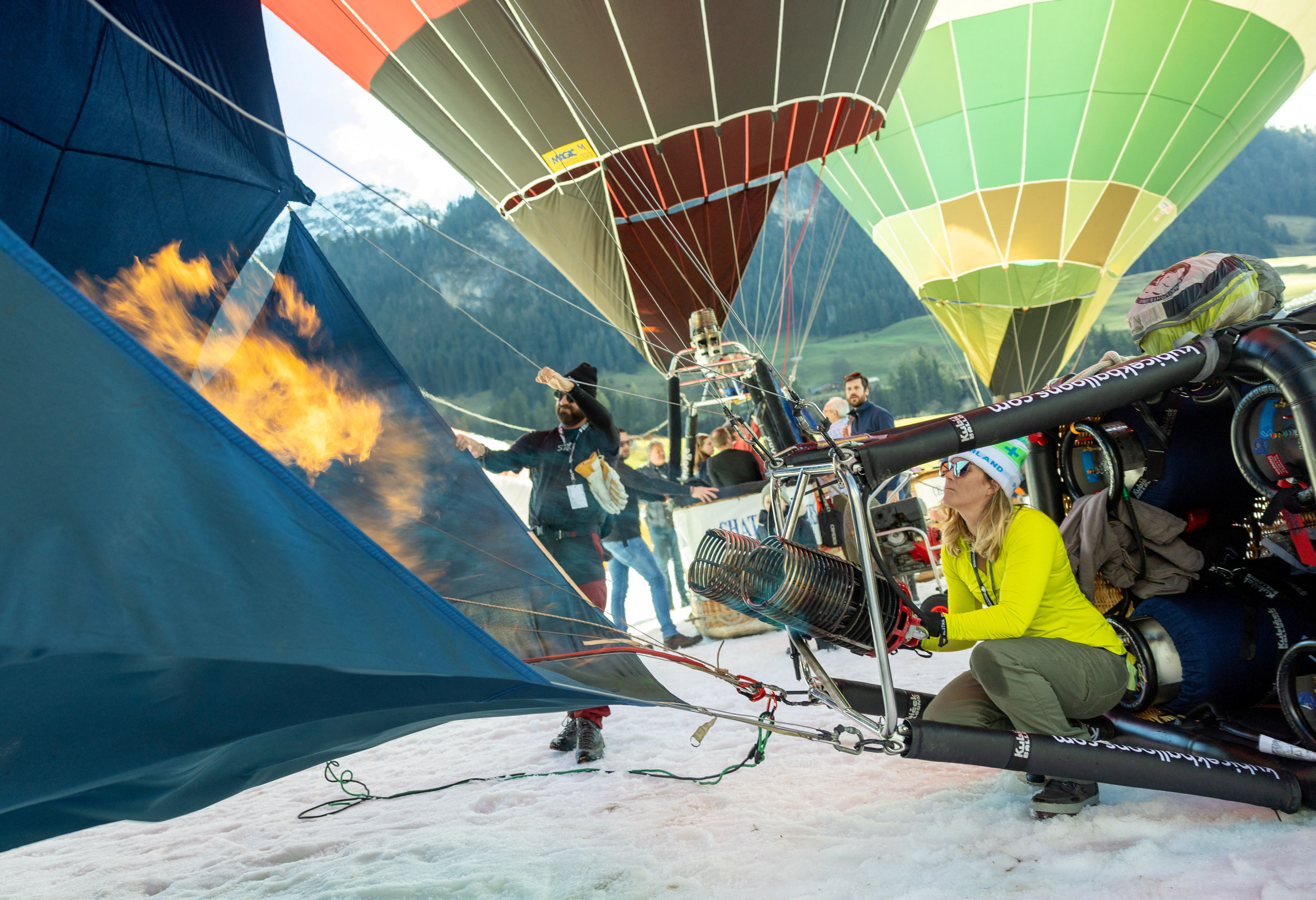 Pilot Amanda Brodbeck prepares her balloon during the 44th International Hot Air Balloon Festival in Chateau-d'Oex, Switzerland on January 25, 2024. (Photo by Denis Balibouse/Reuters)