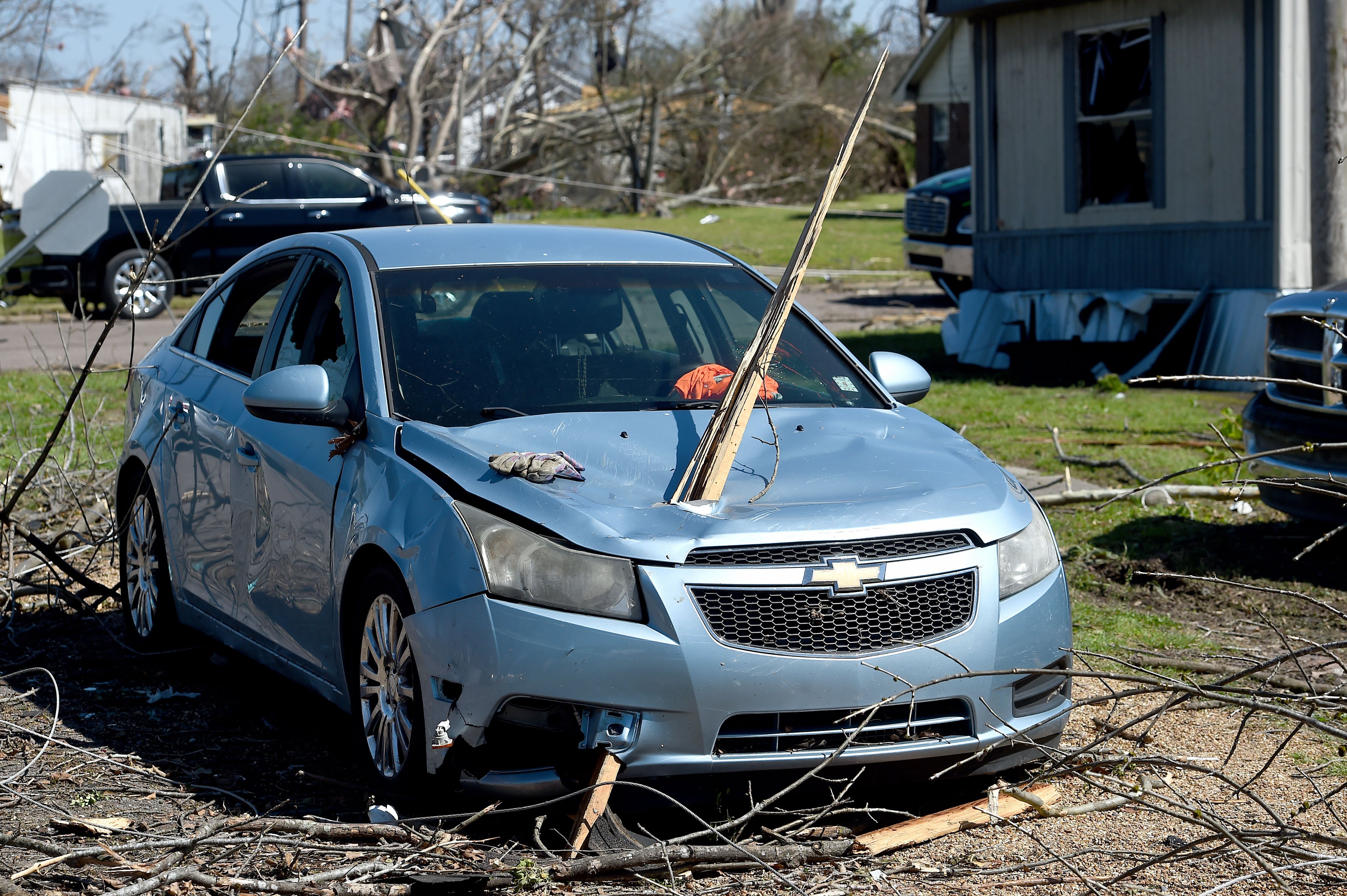 Damage to a vehicle from a series of powerful storms and at least one tornado is seen on March 25, 2023 in Rolling Fork, Mississippi. At least 26 people have reportedly been killed with dozens more injured following devastating storms across western Mississippi. (Photo by Will Newton/Getty Images)