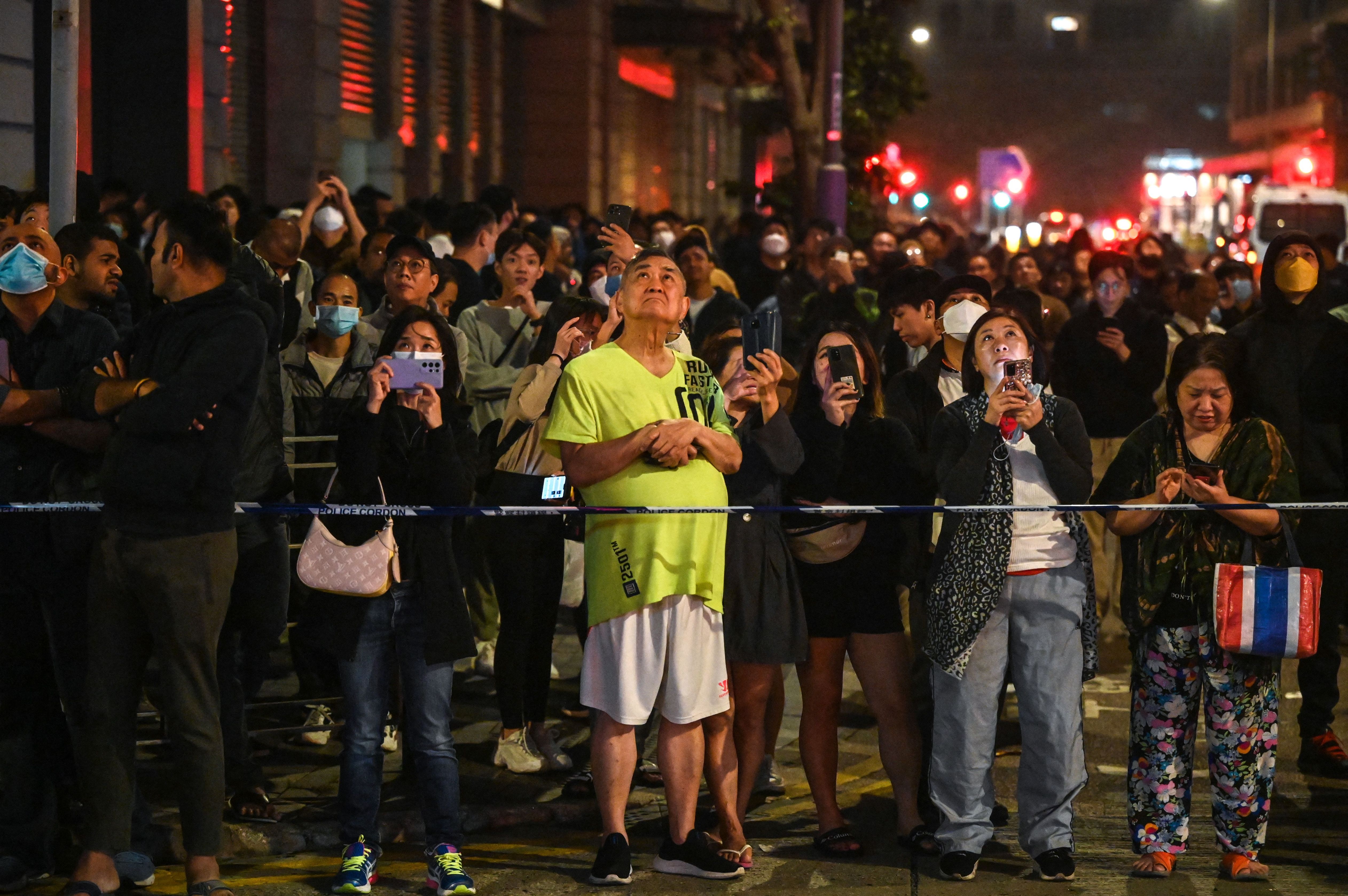 People watch as a fire burns at a high-rise building under construction in the Tsim Sha Tsui district in Hong Kong on March 3, 2023. (Photo by Peter Parks/AFP Photo)