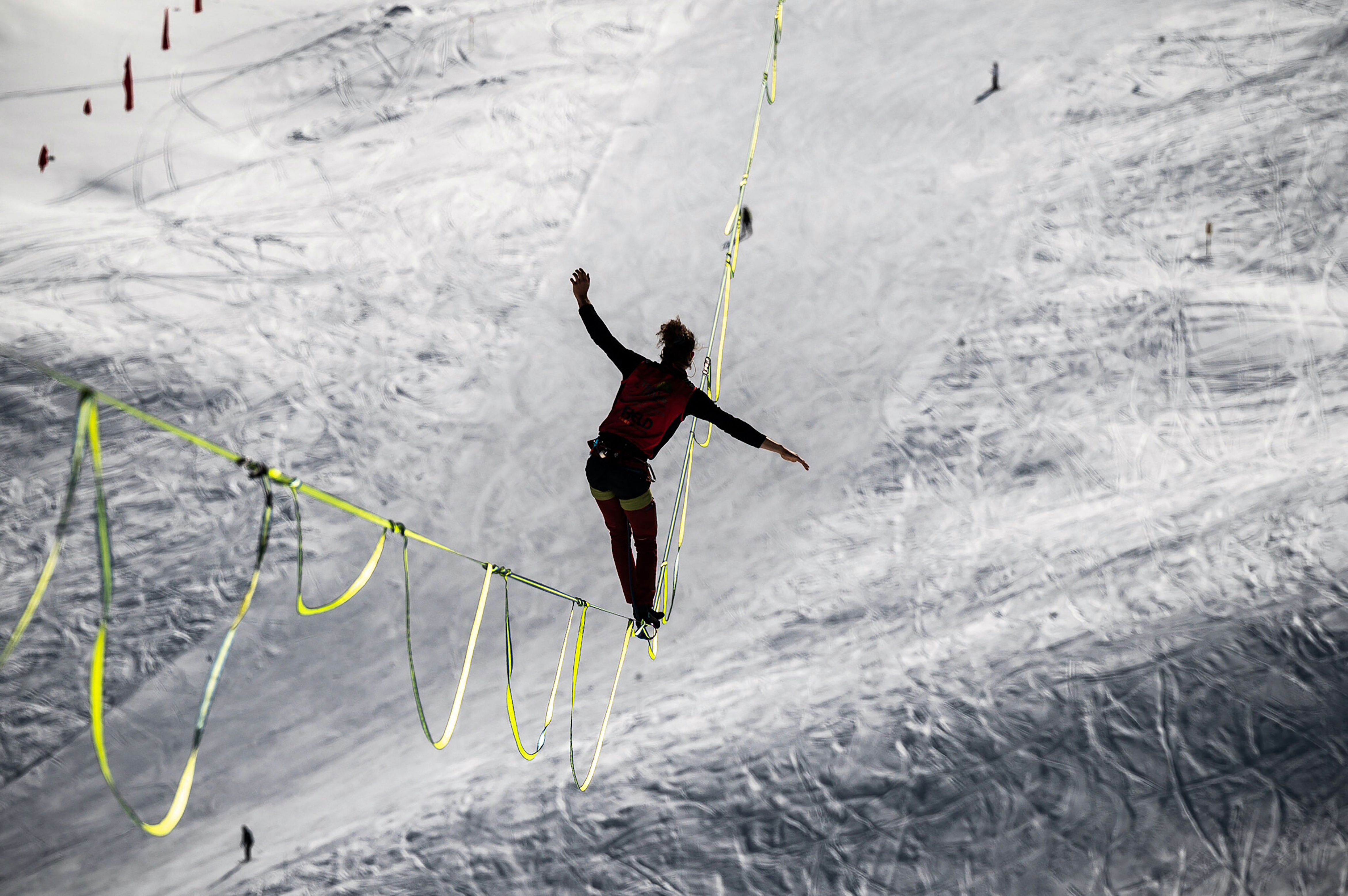 French high liner Arian Perroux, performs at the Piau Engaly ski resort in Aragnouet, south-western France, on March 1, 2023. Members of the “Slackline Pays Basque” association stretched a 1150 meters highline, 200 meters above the slopes of the ski resort and at an altitude of 2200 meters. (Photo by Lionel Bonaventure/AFP Photo)