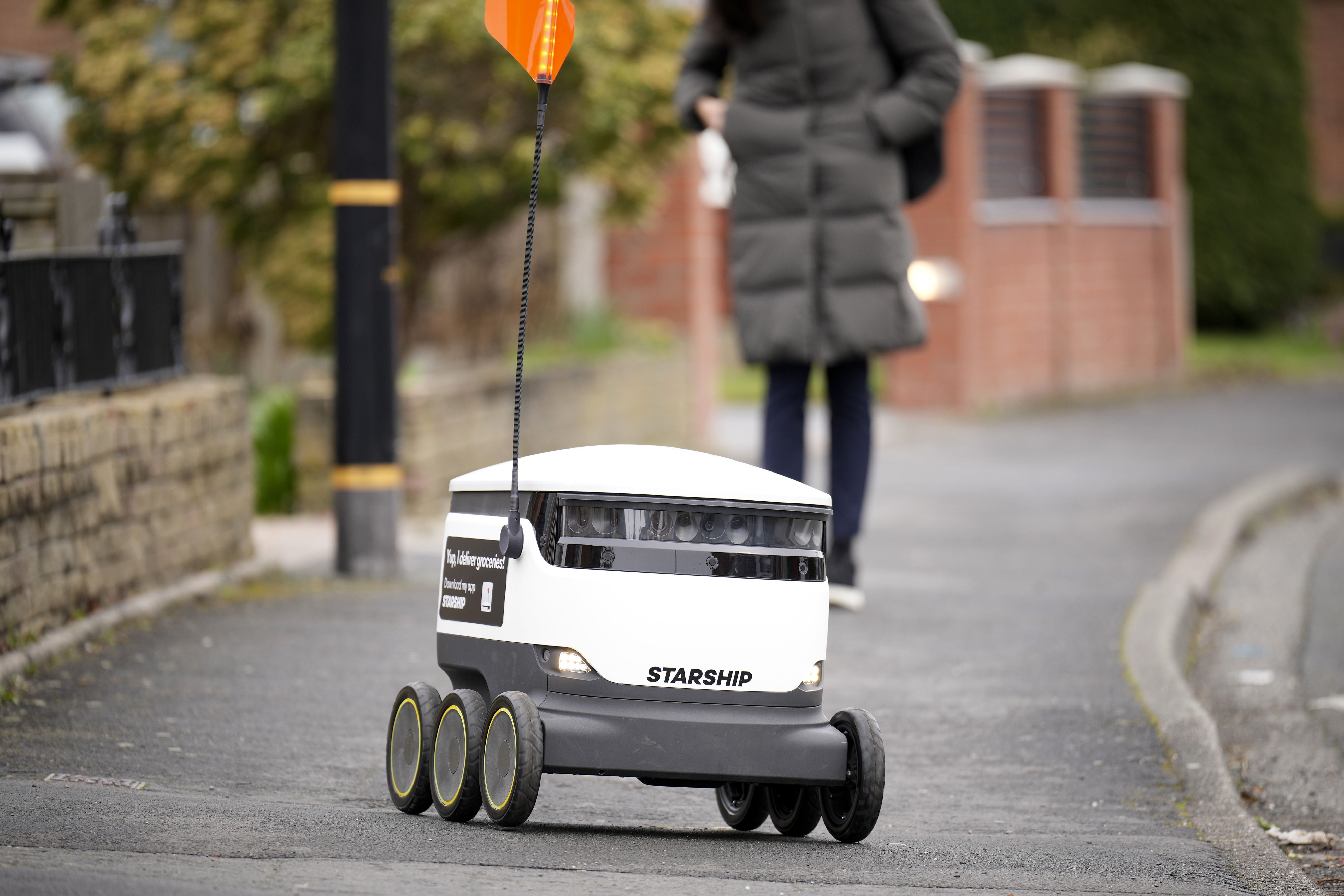 A Starship Technologies robotic vehicle delivers groceries to Co-op customers on March 15, 2023 in Manchester, England. The Co-op has been working with Starship Technologies to develop robots for local home delivery orders. The robots, small white packing cases on six wheels, use sensors and 12 cameras to enable them to navigate. They travel at walking speed, around 4mph, and their advanced technology enables them to manoeuvre around objects and people and wait until it is safe to cross the road. To deter thieves the little robot has a loud alarm which sounds if tampered with plus they are too heavy to pick up. (Photo by Christopher Furlong/Getty Images)