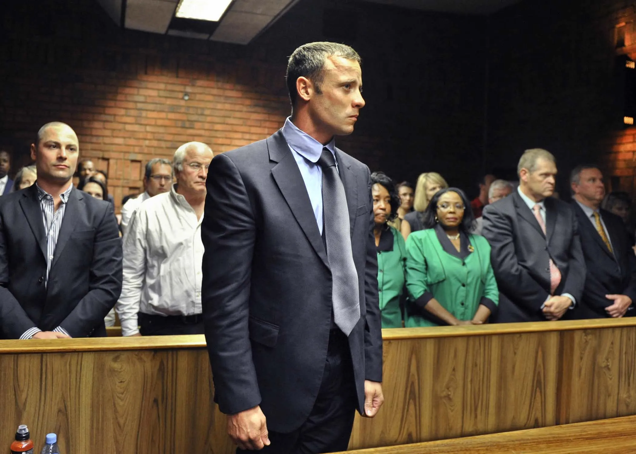Olympic runner Oscar Pistorius stands following his bail hearing in Pretoria, South Africa, February 19, 2013. Pistorius is accused of firing a gun through the door of a small bathroom killing his girlfriend after a shouting match on Valentine's Day. (Photo by Associated Press)