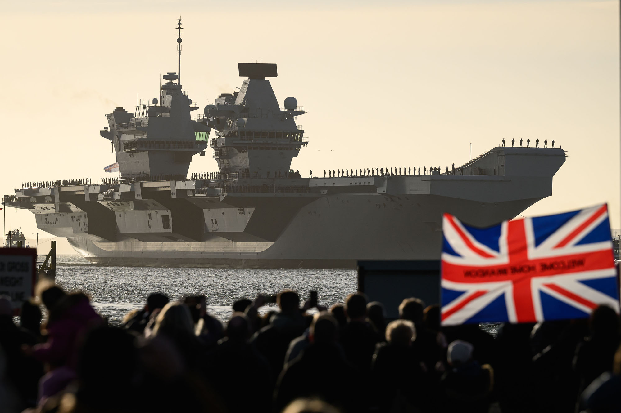 Members of the public watch as Naval personnel perform procedure alpha as they stand on deck during the arrival of the United Kingdom's biggest warship, the HMS Prince of Wales aircraft carrier, following a three months deployment, on December 11, 2023 in Portsmouth, England. HMS Prince of Wales recently finished sea and air trials in the eastern United States, enhancing the capabilities of UK's aircraft carriers, especially in launching and landing F-35s under challenging weather conditions. (Photo by Leon Neal/Getty Images)
