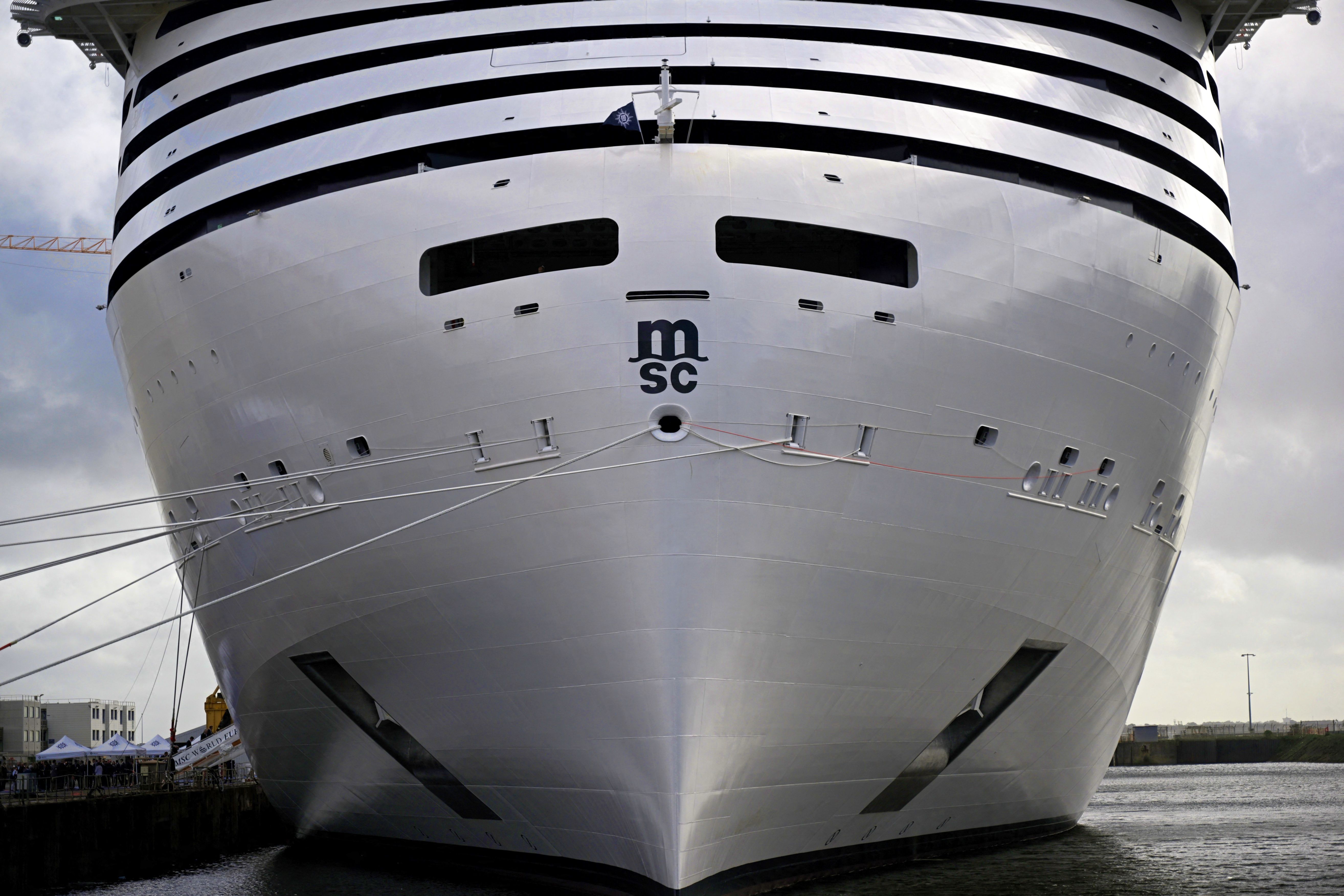 This photograph taken on October 24, 2022, shows a view of the Ocean liner MSC World Europa, equipped with a liquified natural gas (LNG) propulsion system, during its delivery ceremony at Saint-Nazaire's harbour, western France. (Photo by Damien Meyer/AFP Photo)