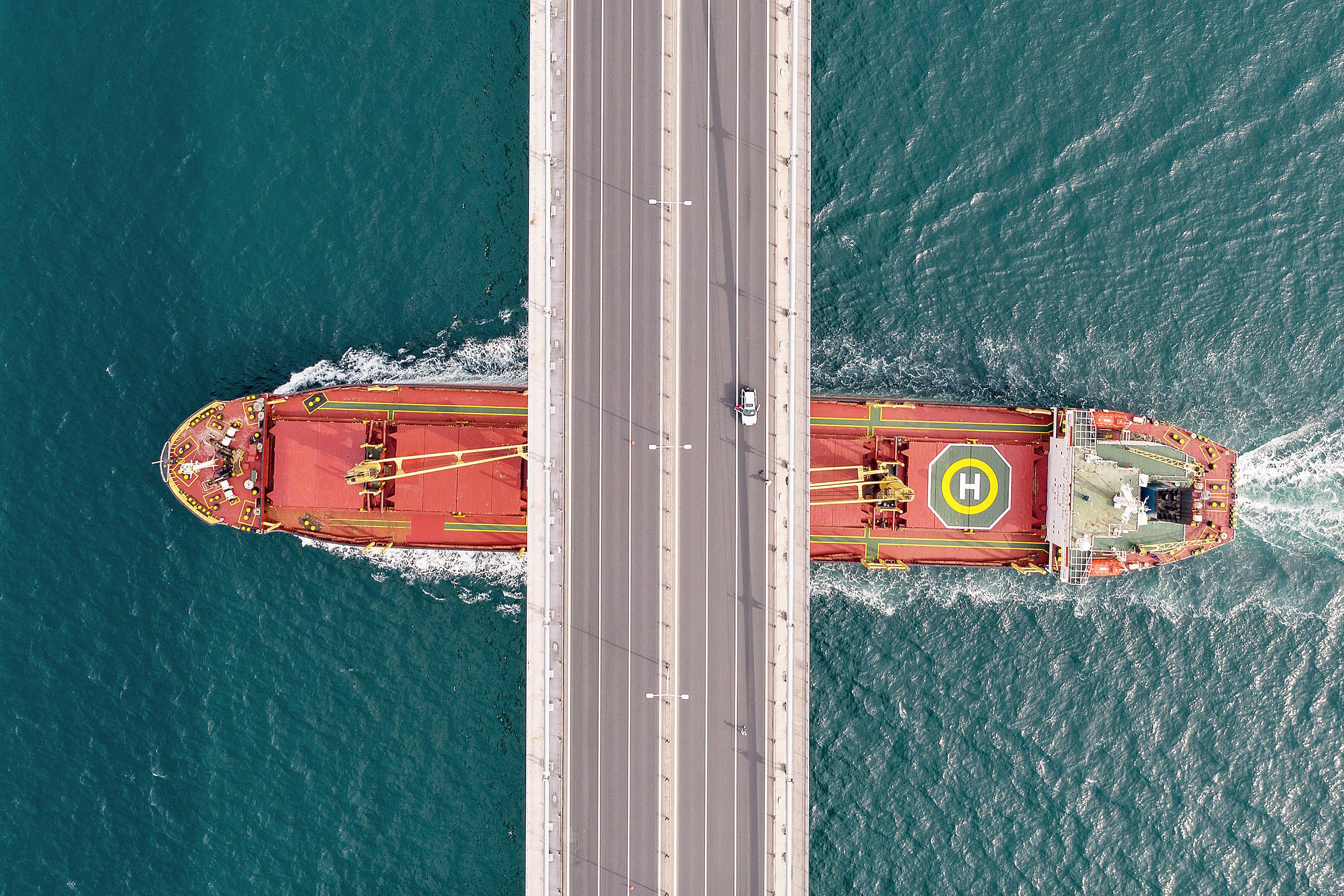 A ship makes its way up the Bosphorus strait as small number of cars cross a near empty July 15 Martyrs' Bridge (Bosphorus Bridge) during a two-day lockdown imposed to prevent the spread of COVID-19 on April 19, 2020 in Istanbul, Turkey. For the second weekend Turkey has lockdown more than two dozen cities, including Istanbul and the capital, Ankara. Turkey has reported over 86,000 cases of COVID-19 and over 2,000 related deaths. (Photo by Burak Kara/Getty Images)