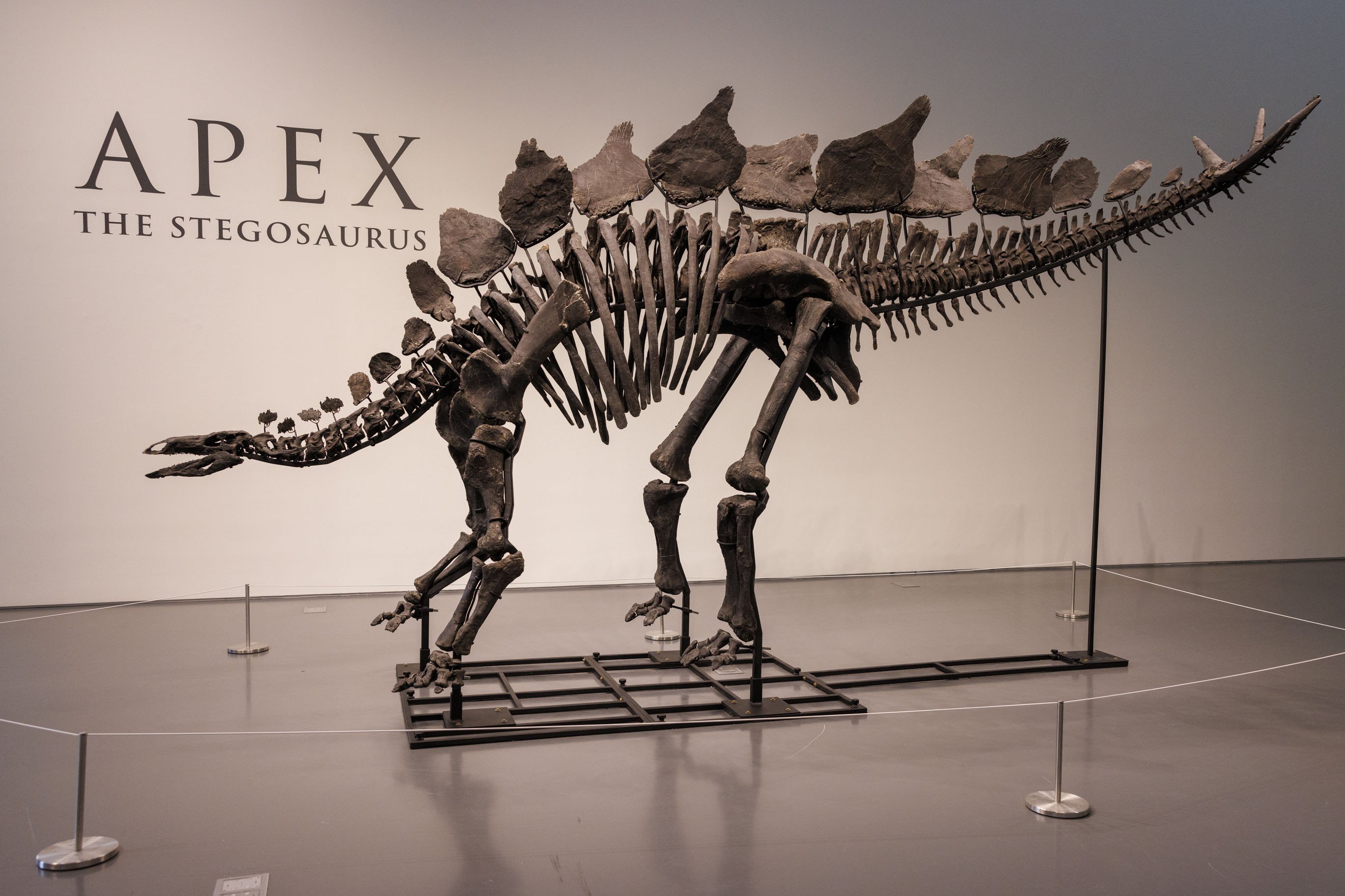 The 150-million-year-old skeleton of a stegosaurus named “Apex”, is displayed at Sotheby's auction house in New York, New York, USA, 10 July 2024. “Apex”, measuring 11 feet tall and over 20 feet long, is the most complete and best preserved large-scale Stegosaurus specimen ever discovered. The fossil is set to be the main piece of Sotheby's Live Natural History Auction on 17 July, carrying an estimate of four to six million US dollars. (Photo by Sarah Yenesel/EPA/EFE)