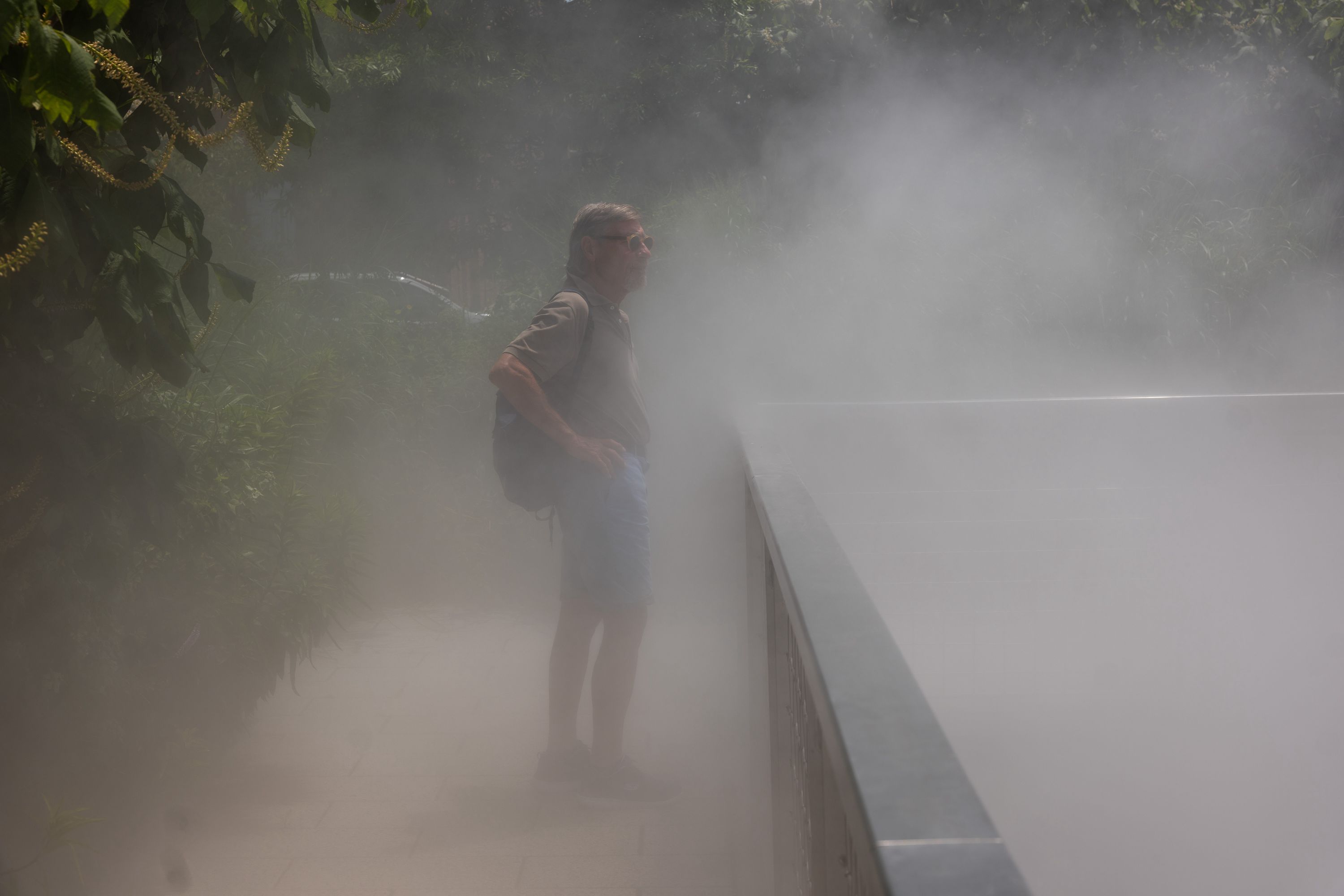 A man walks through cooling mist on a hot afternoon at a park in Brooklyn on July 08, 2024 in New York City. New Yorkers descend on area beaches, parks, pools and cooling centers as the city experiences its second heat wave of the summer season. (Photo by Spencer Platt/Getty Images)