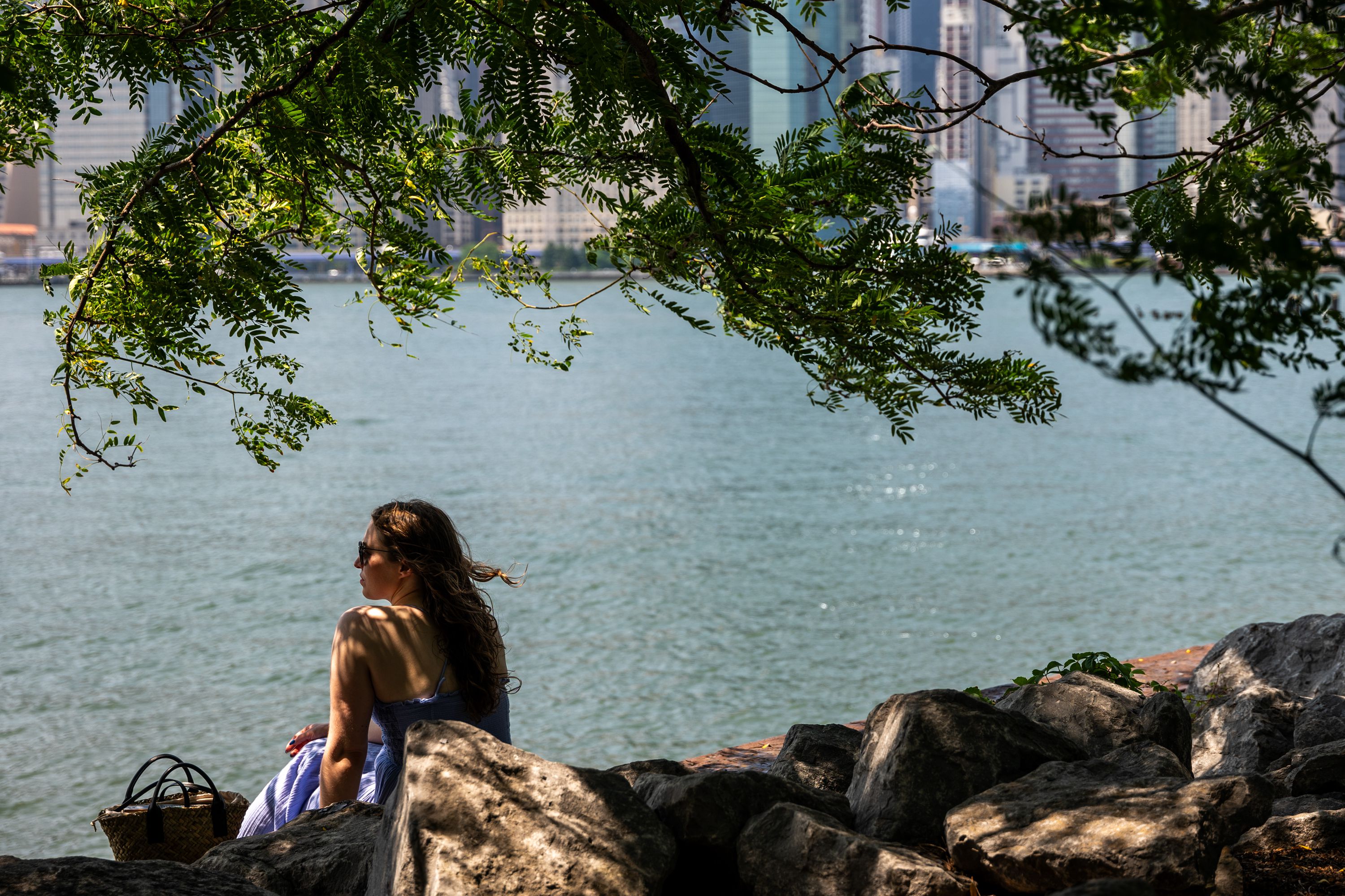 A woman pauses by the water in Brooklyn on a hot afternoon on July 09, 2024 in New York City. Thousands of New Yorkers are descending to area beaches, parks, pools, and cooling centers as the city experiences its second heat wave of the summer season. (Photo by Spencer Platt/Getty Images)