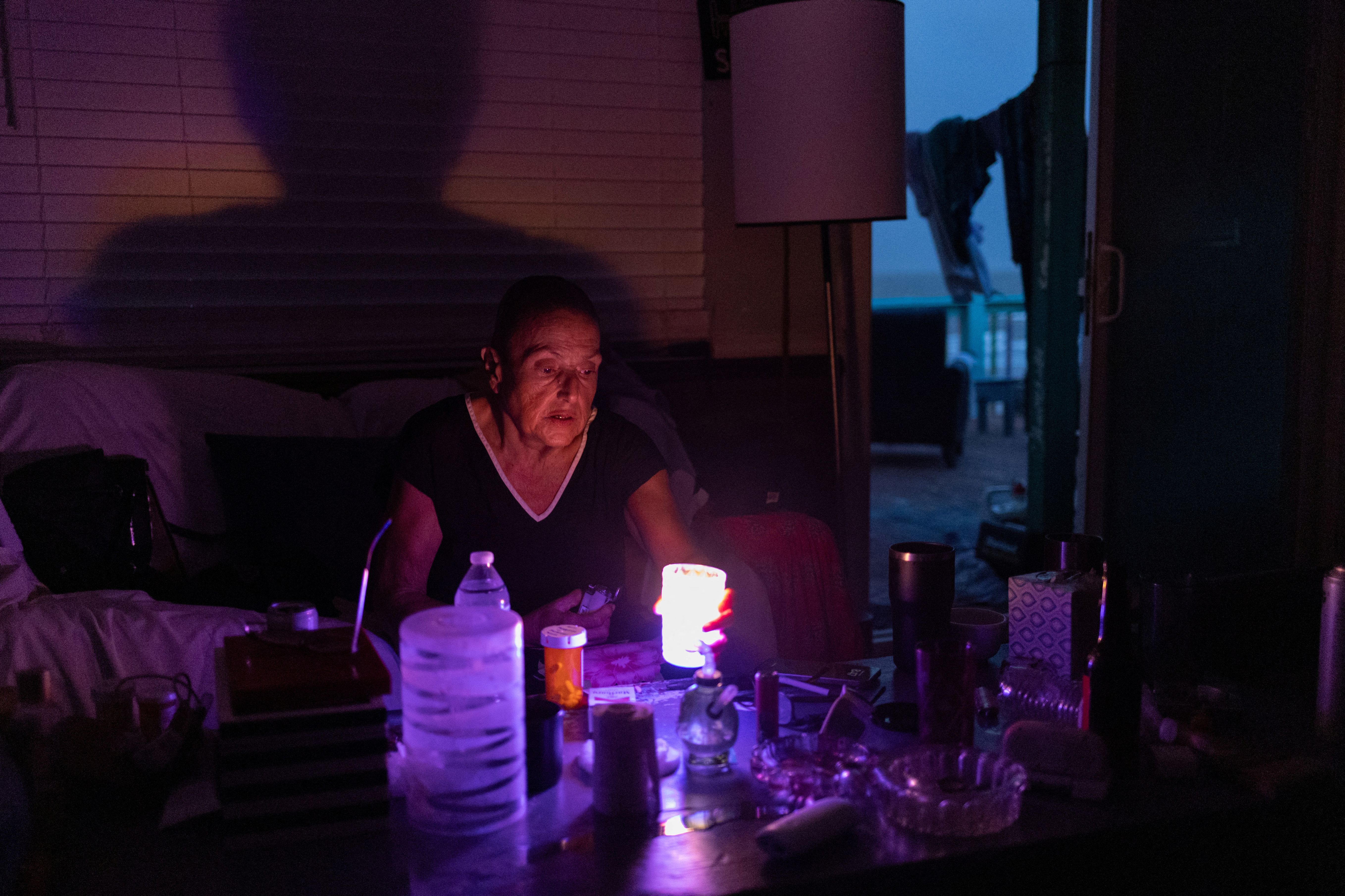 Marguerite Thomas lights candles at dusk after losing electricity due to Hurricane Beryl in Surfside Beach, Texas on July 9, 2024. (Photo by Adrees Latif/Reuters)