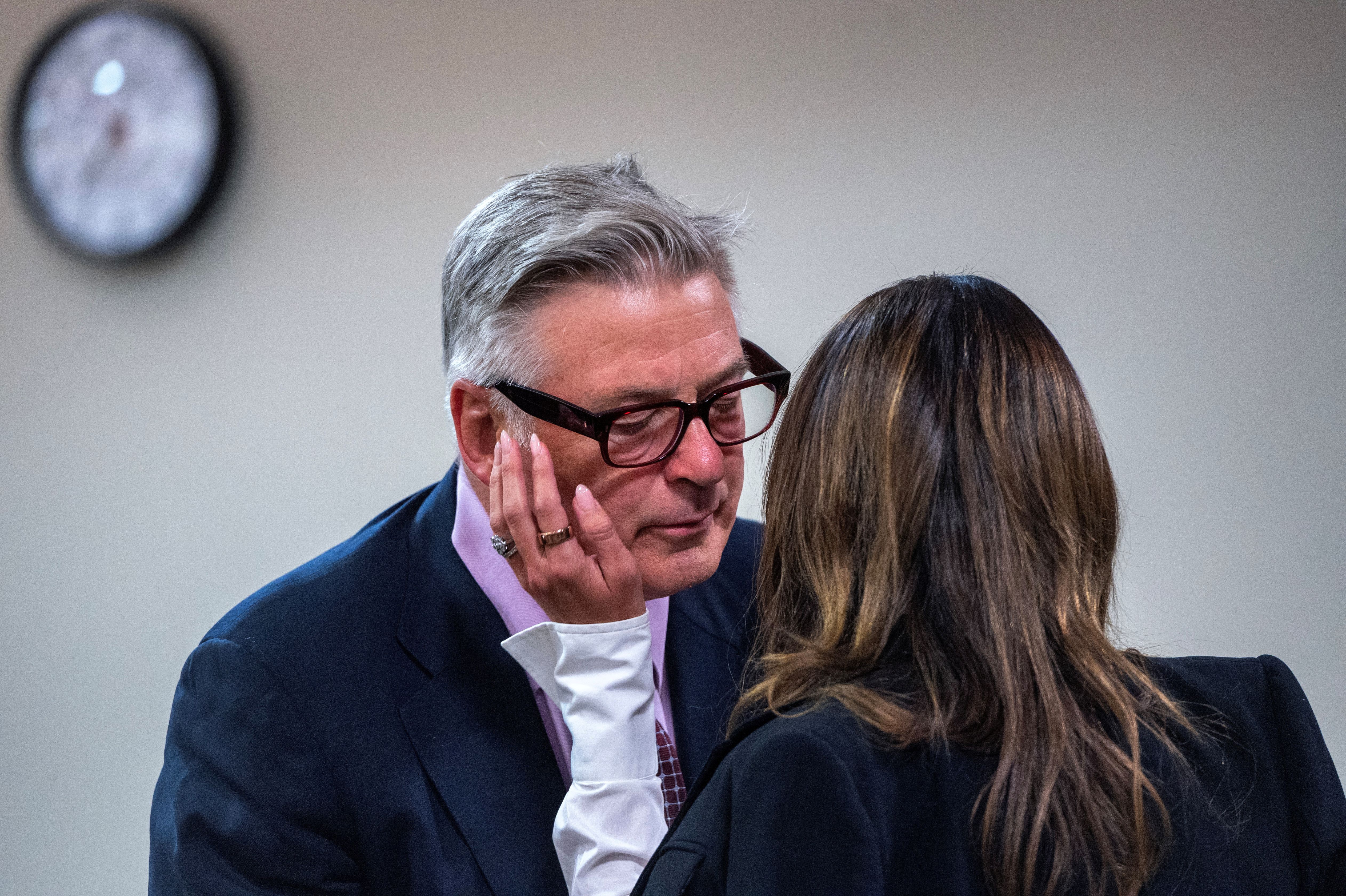 Actor and producer Alec Baldwin talks with his wife Hilaria Baldwin in First District Court during the first day of testimony in the case against him, in Santa Fe, N.M. Wednesday, July 10, 2024. Baldwin is on trial for the charge of involuntary manslaughter related to the death of cinematographer Halyna Hutchins during the filming of the movie Rust in 2021. (Photo by Eddie Moore/Journal/Pool via Reuters)
