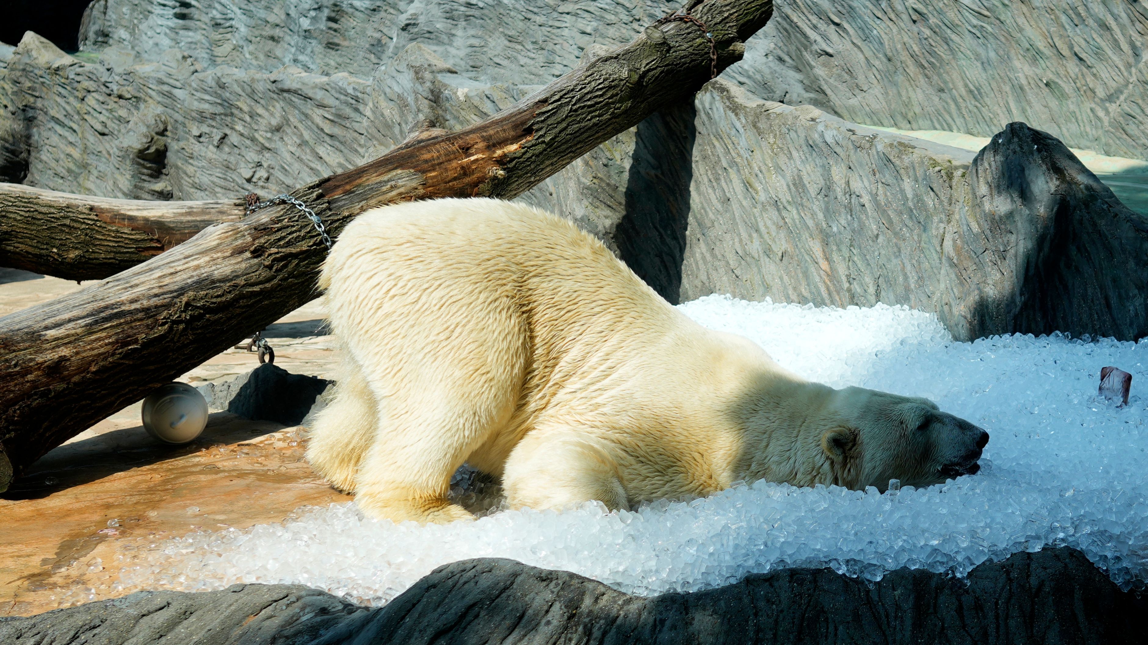 A polar bear cools down in ice that was brought to its enclosure on a hot and sunny day at the Prague zoo, Czech Republic, Wednesday, July 10, 2024. (Photo by Petr David Josek/AP Photo)