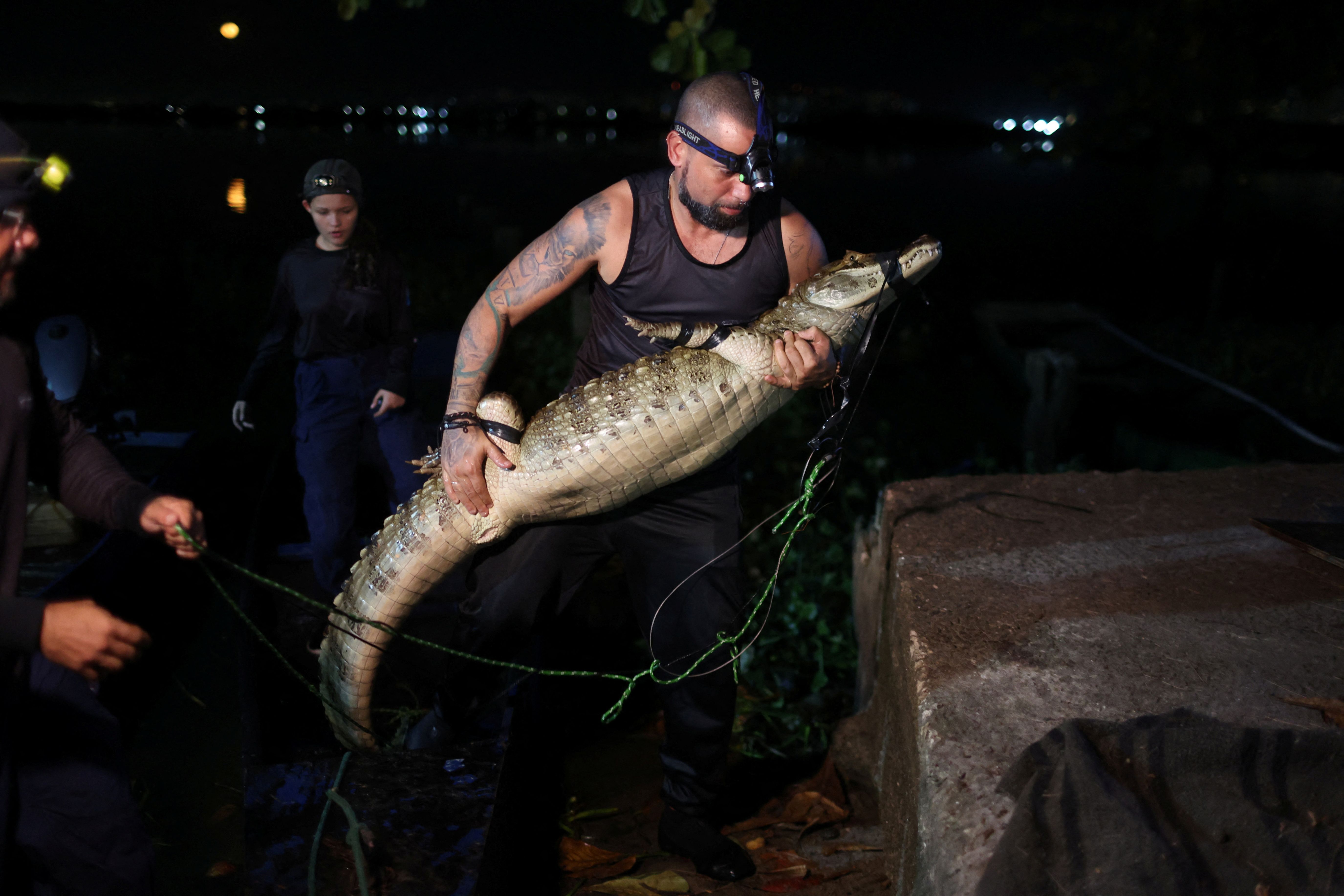 Phillipi Dutra, technician of the Jacare Institute, carries a Broad-snouted caiman (Caiman latirostris), as part of the work for the preservation and rescue of caimans native to the Jacarepagua lagoon complex, which are endangered due to urban expansion and sewage pollution, in Rio de Janeiro, Brazil on June 24, 2024. (Photo by Pilar Olivares/Reuters)