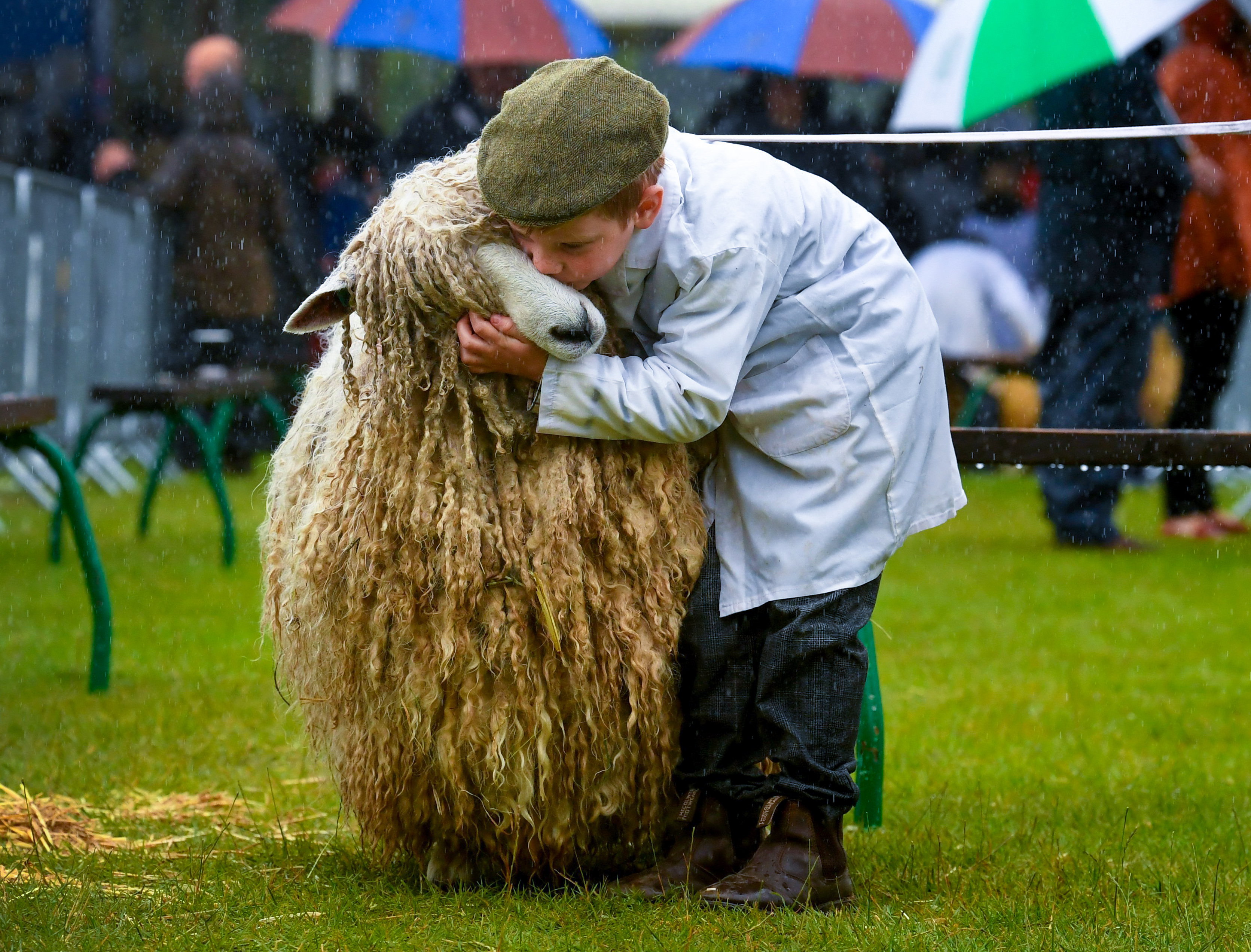 Benjamin Brook aged 6 from Camblesforth hugs his Lincoln Longwool Skylark Orange at the Great Yorkshire Show, UK on July 10, 2024. (Photo by South West News Service)
