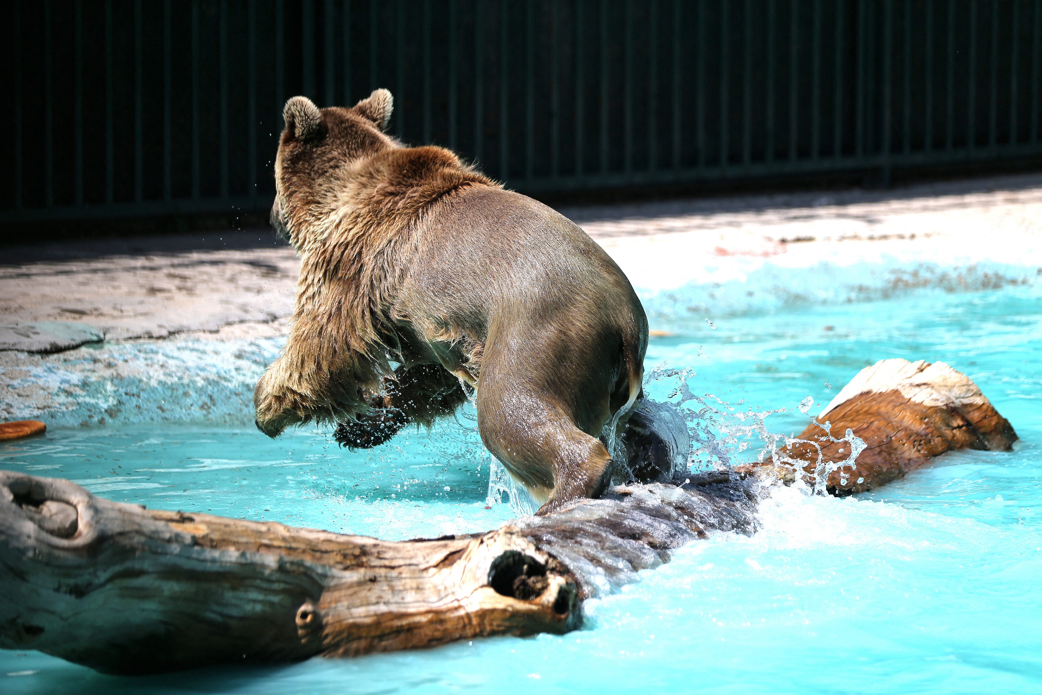A bear cools off in a pond where wild animals cool off in Konya, Turkiye on July 09, 2024. Careful efforts are being made to ensure that the protected brown bear siblings “Efe” and “Ege” spend their summers and winters comfortably. The bears spend the winter months sleeping in the cave-like area, and spend the summer months in a garden with a pool, where they cool off by swimming in the pool when the heat becomes too much. (Photo by Serhat Cetinkaya/Anadolu/Abaca Press)